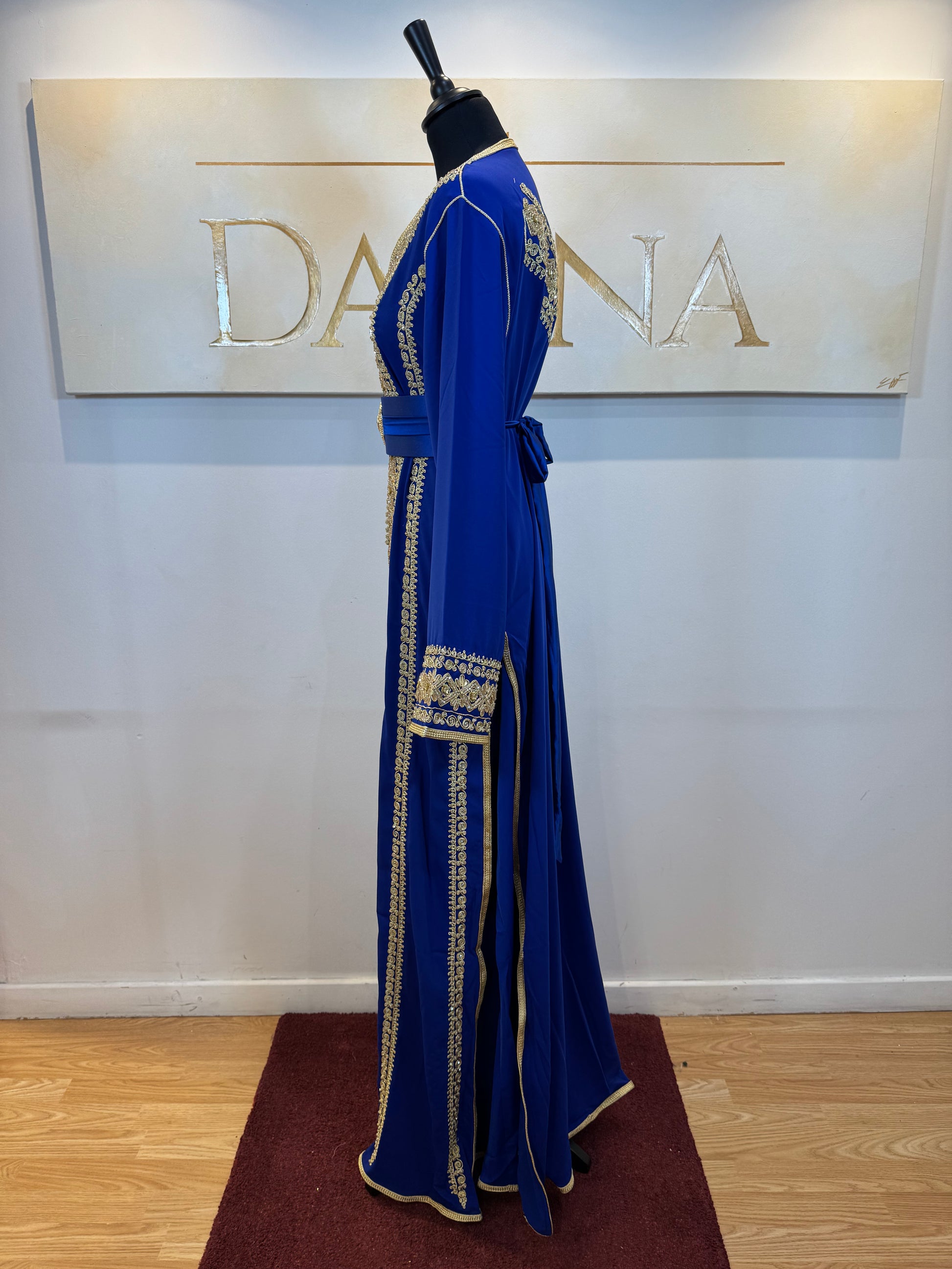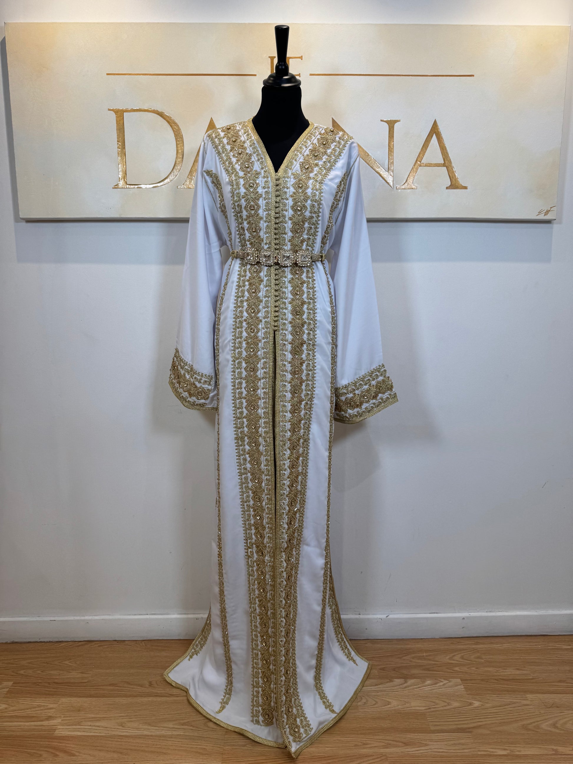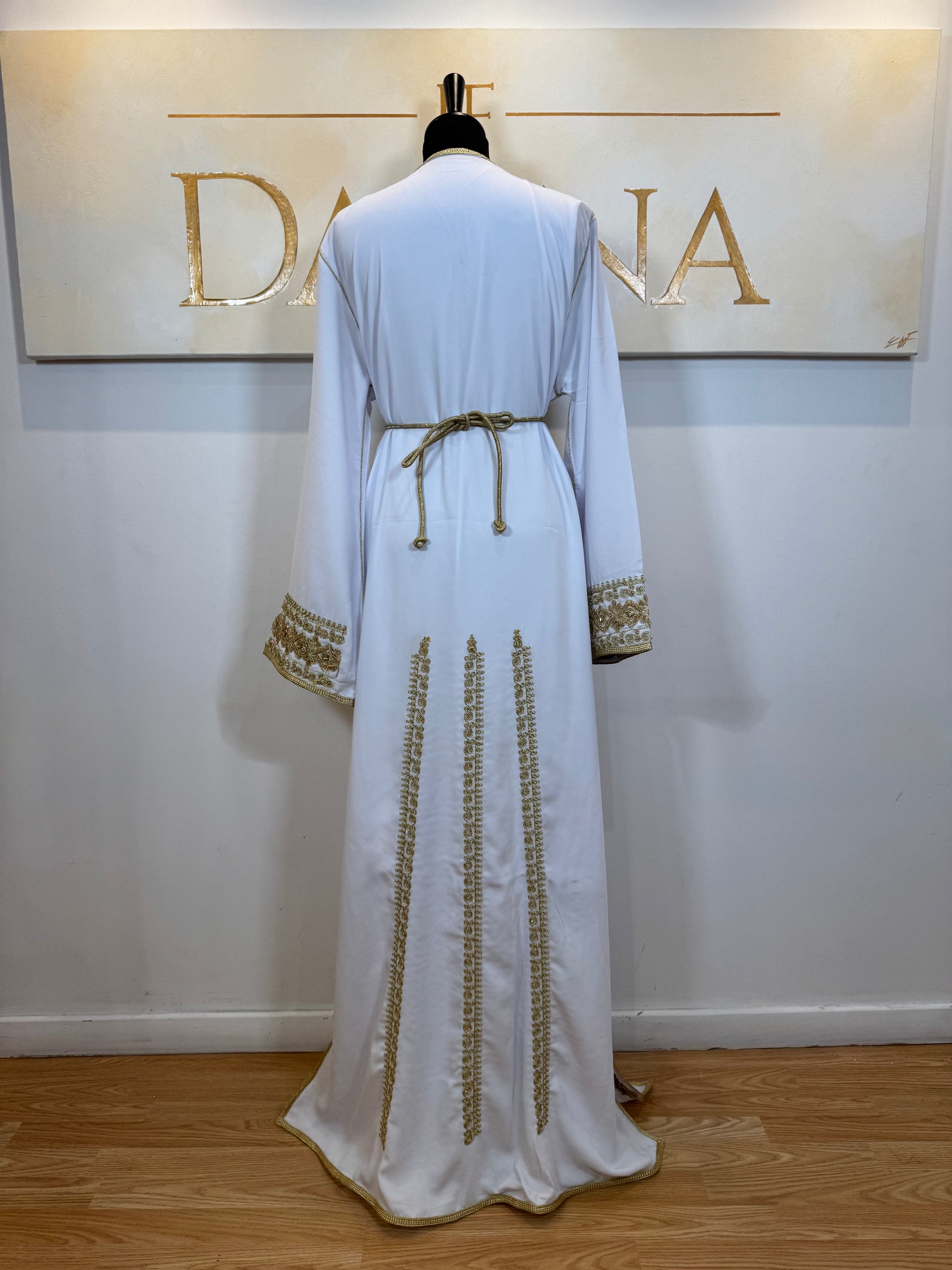 Le modèle Altesse séduit par ses broderies dorées finement travaillées et son allure résolument noble. Sa coupe longue apporte une présence élégante, tandis que les détails brodés structurent la robe avec caractère, aussi bien à l’avant qu’au dos.