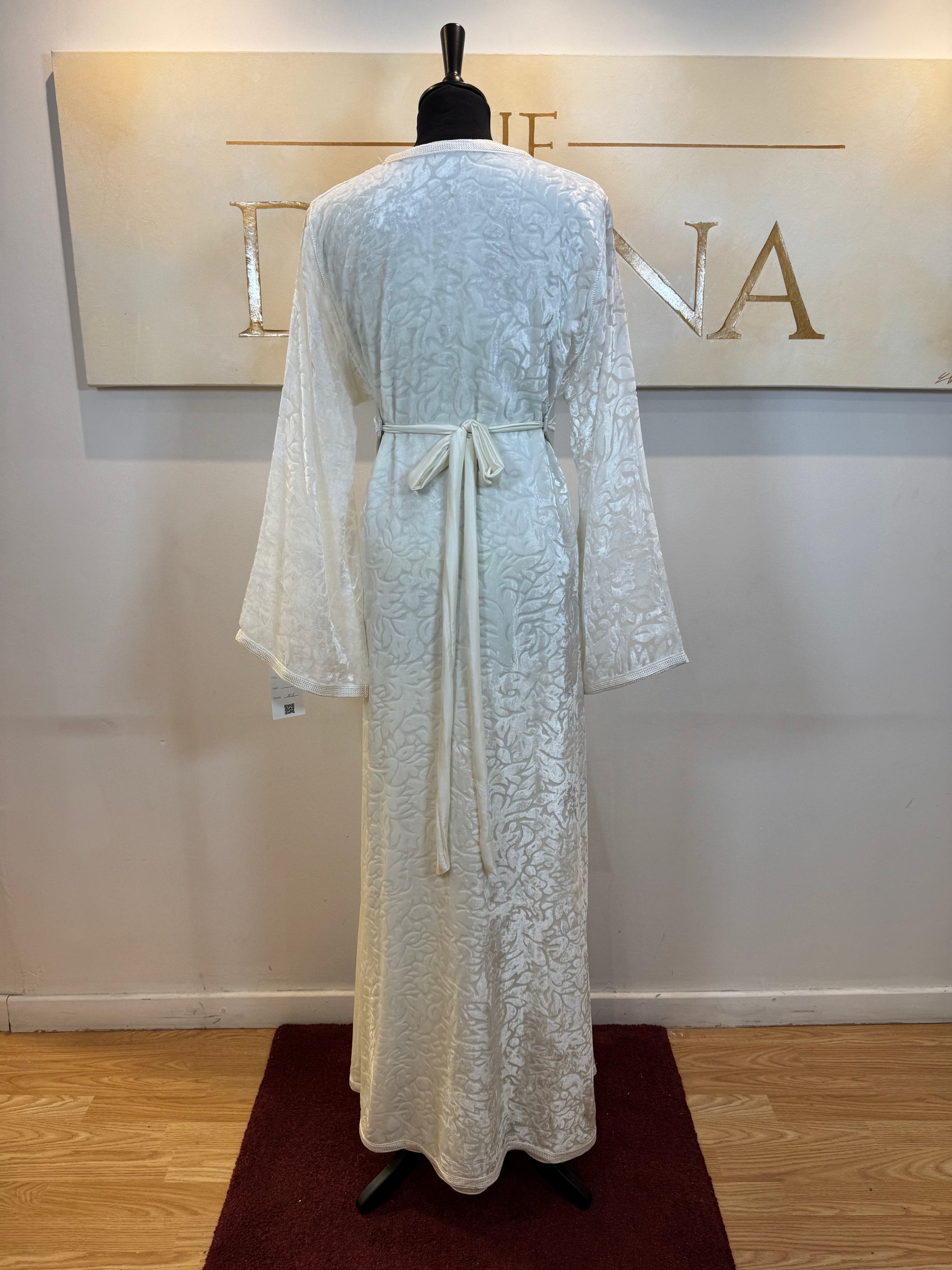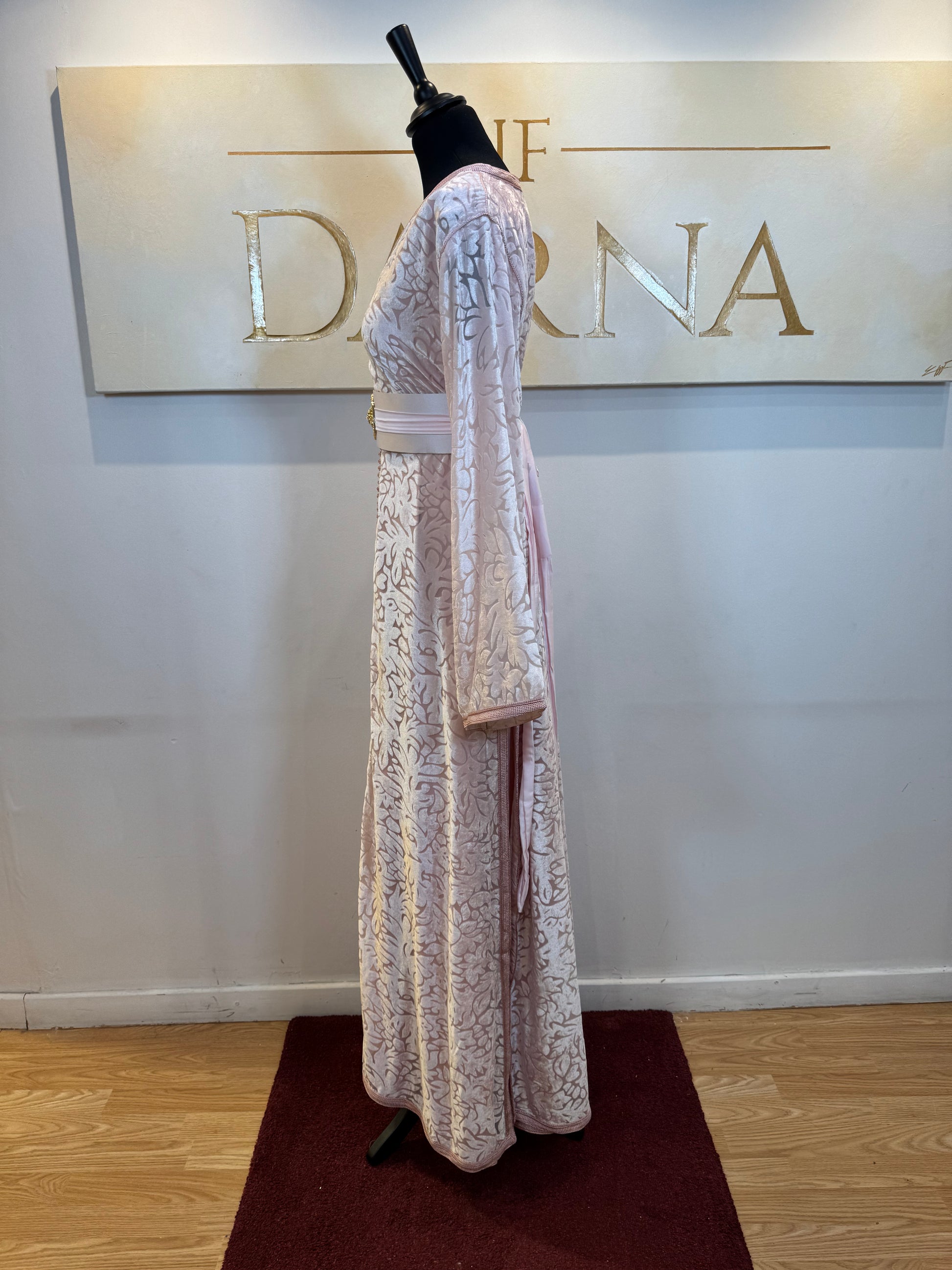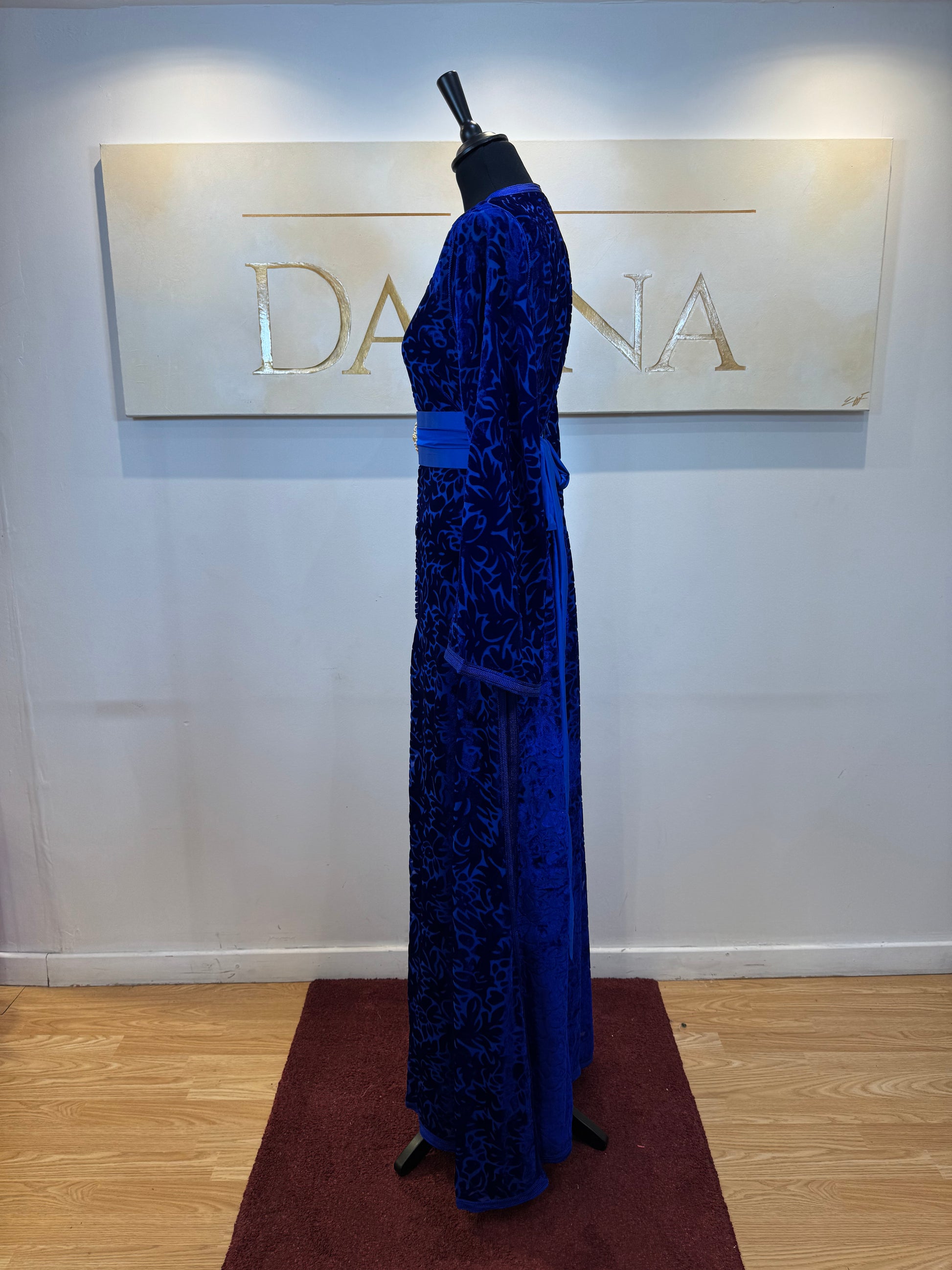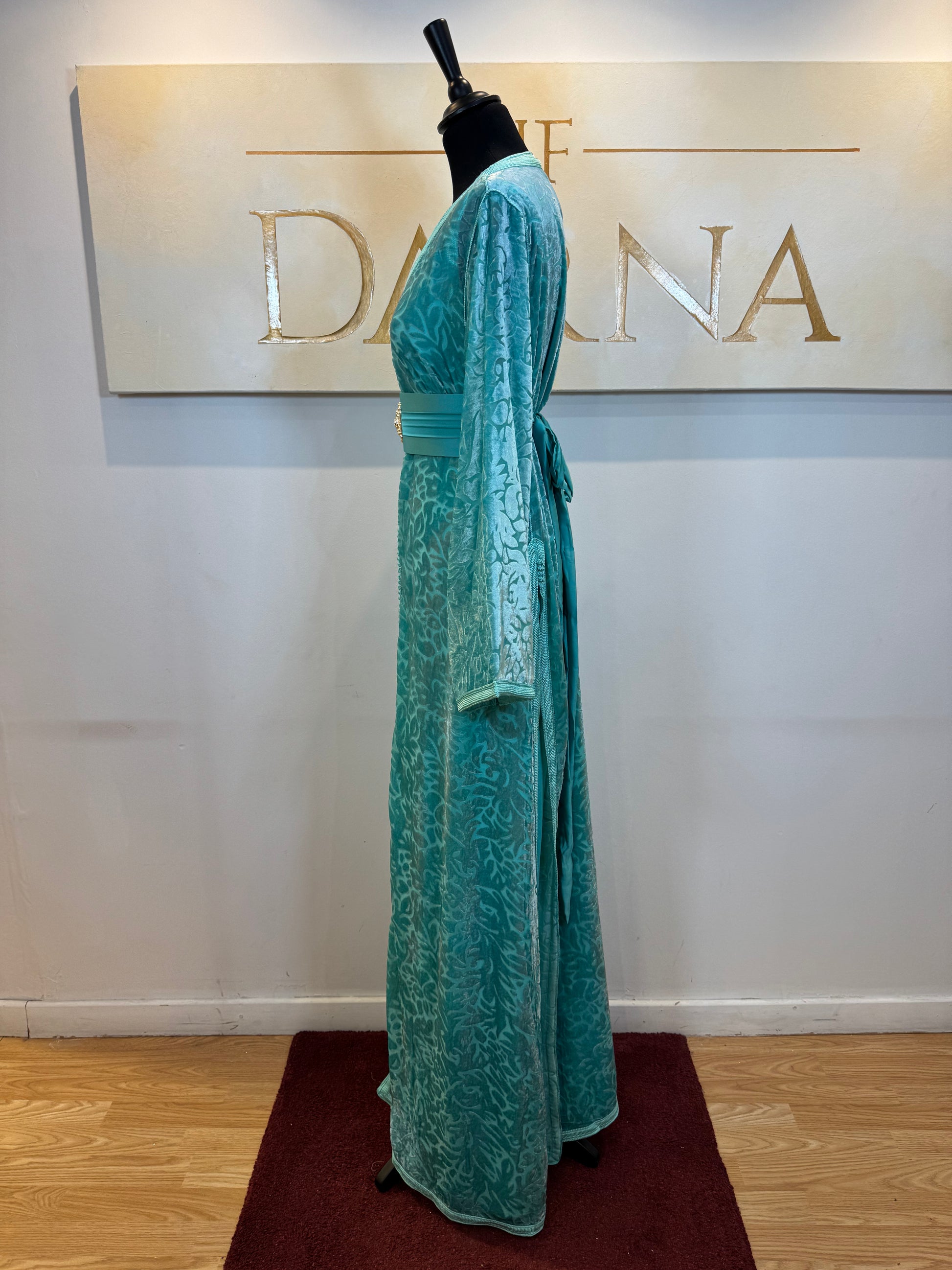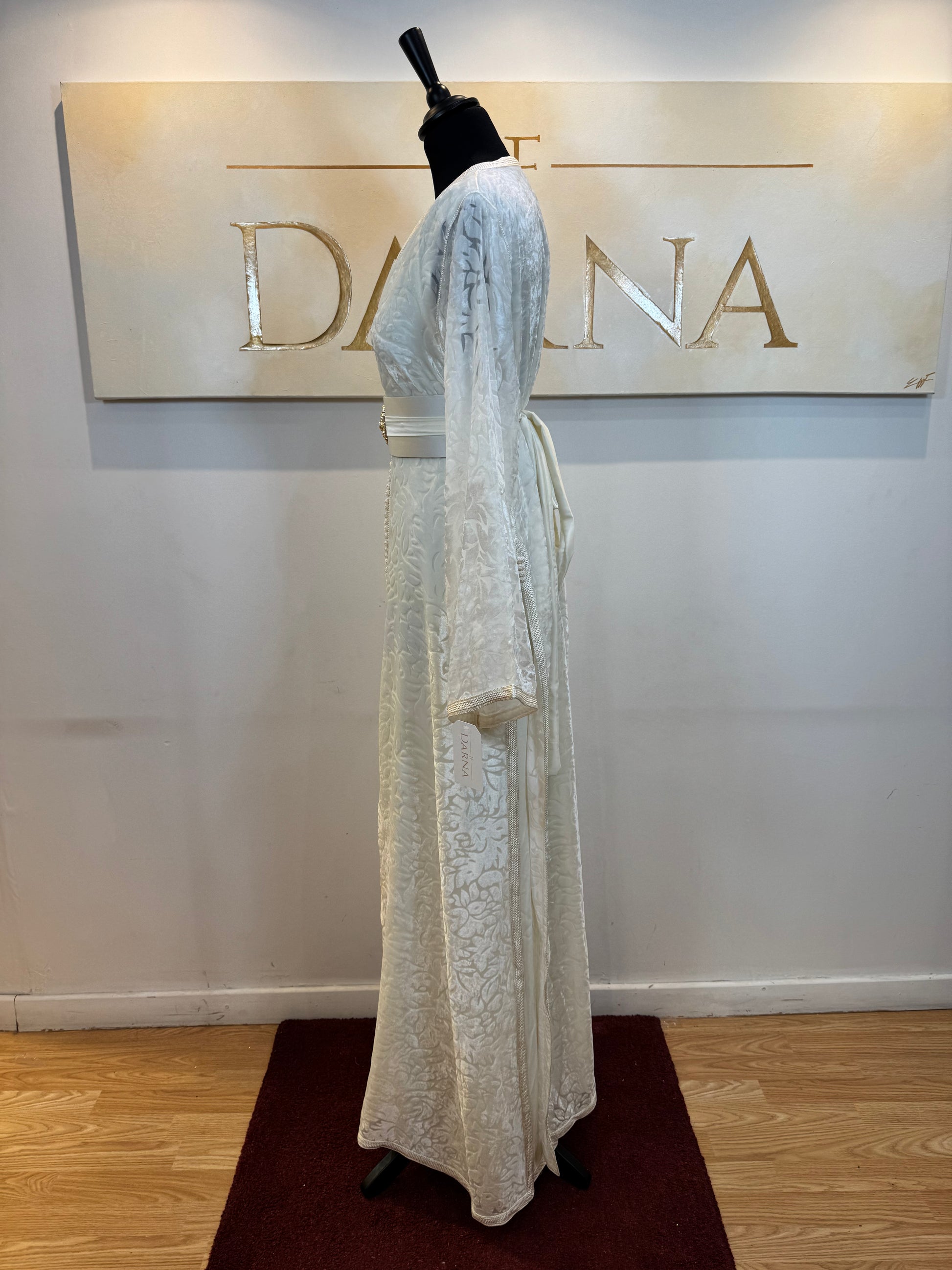 Le modèle Farah est une robe longue élégante, caractérisée par son tissu texturé aux motifs subtils et sa ceinture intégrée qui structure la silhouette avec finesse. Sa coupe fluide assure un tombé naturel, idéal pour les cérémonies et événements habillés.