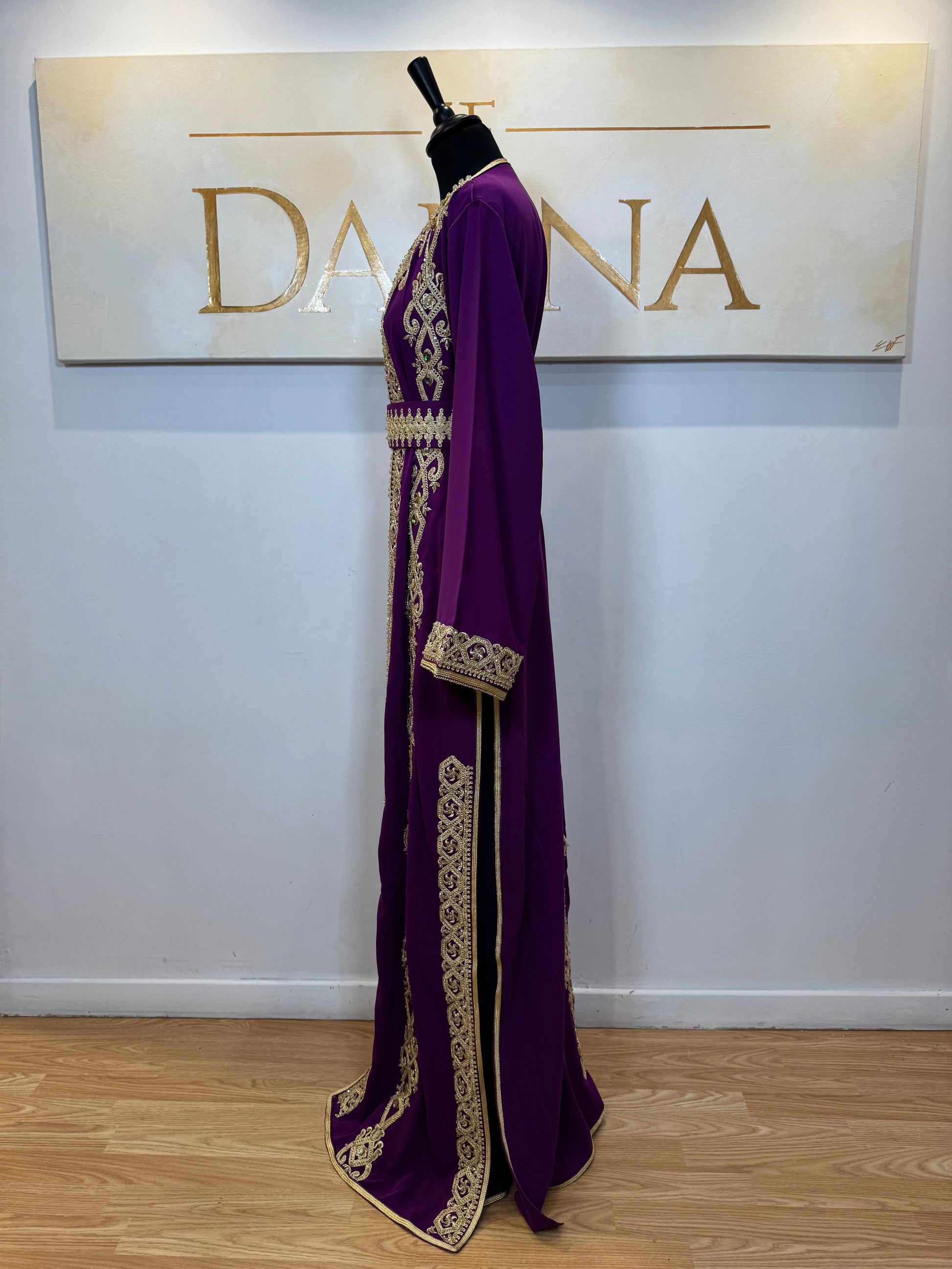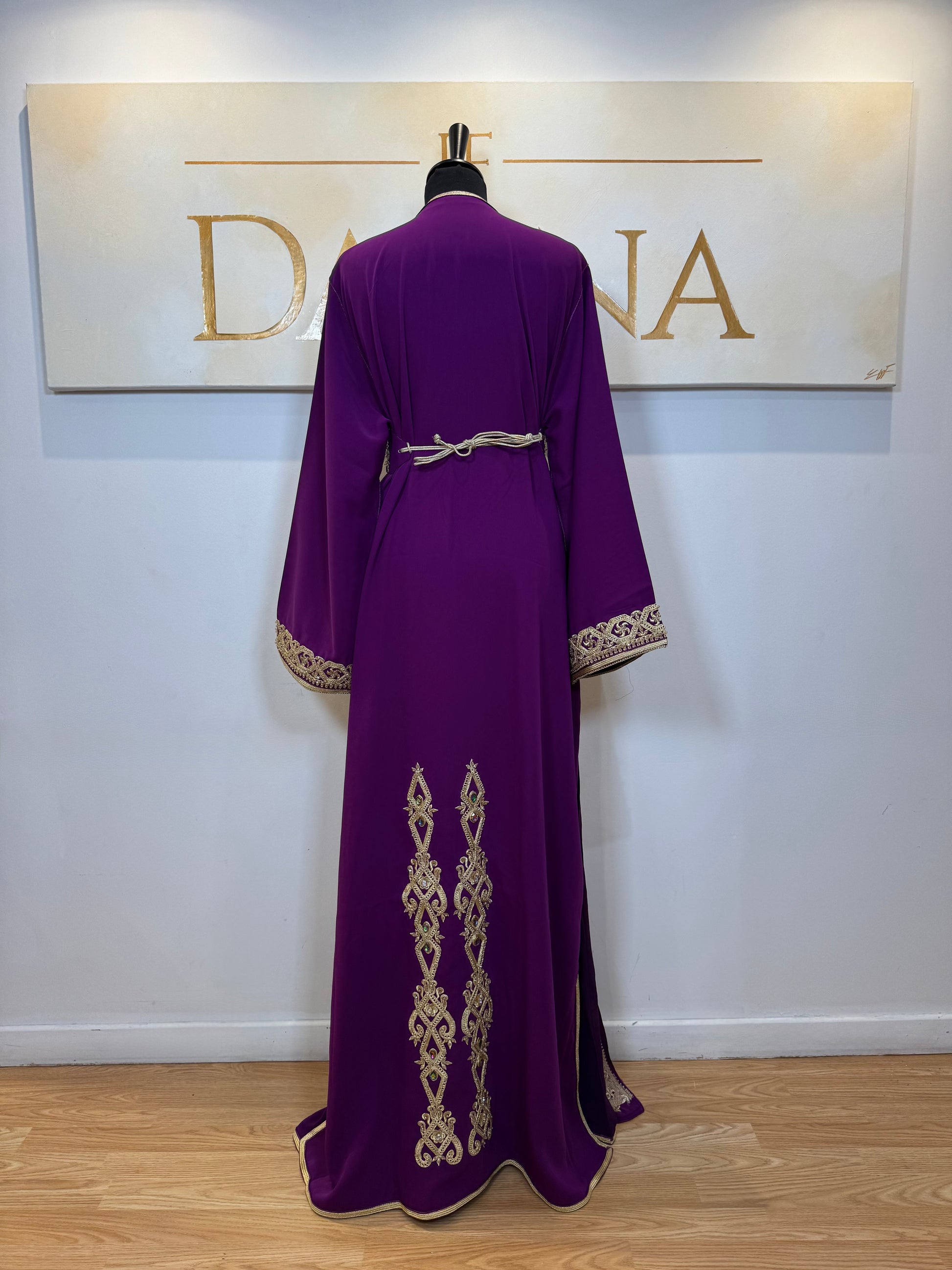 Le modèle Imane se distingue par son coloris violet profond et ses broderies dorées finement dessinées, apportant un contraste élégant et structuré. Les motifs verticaux allongent visuellement la silhouette et donnent à la robe une allure harmonieuse et affirmée.