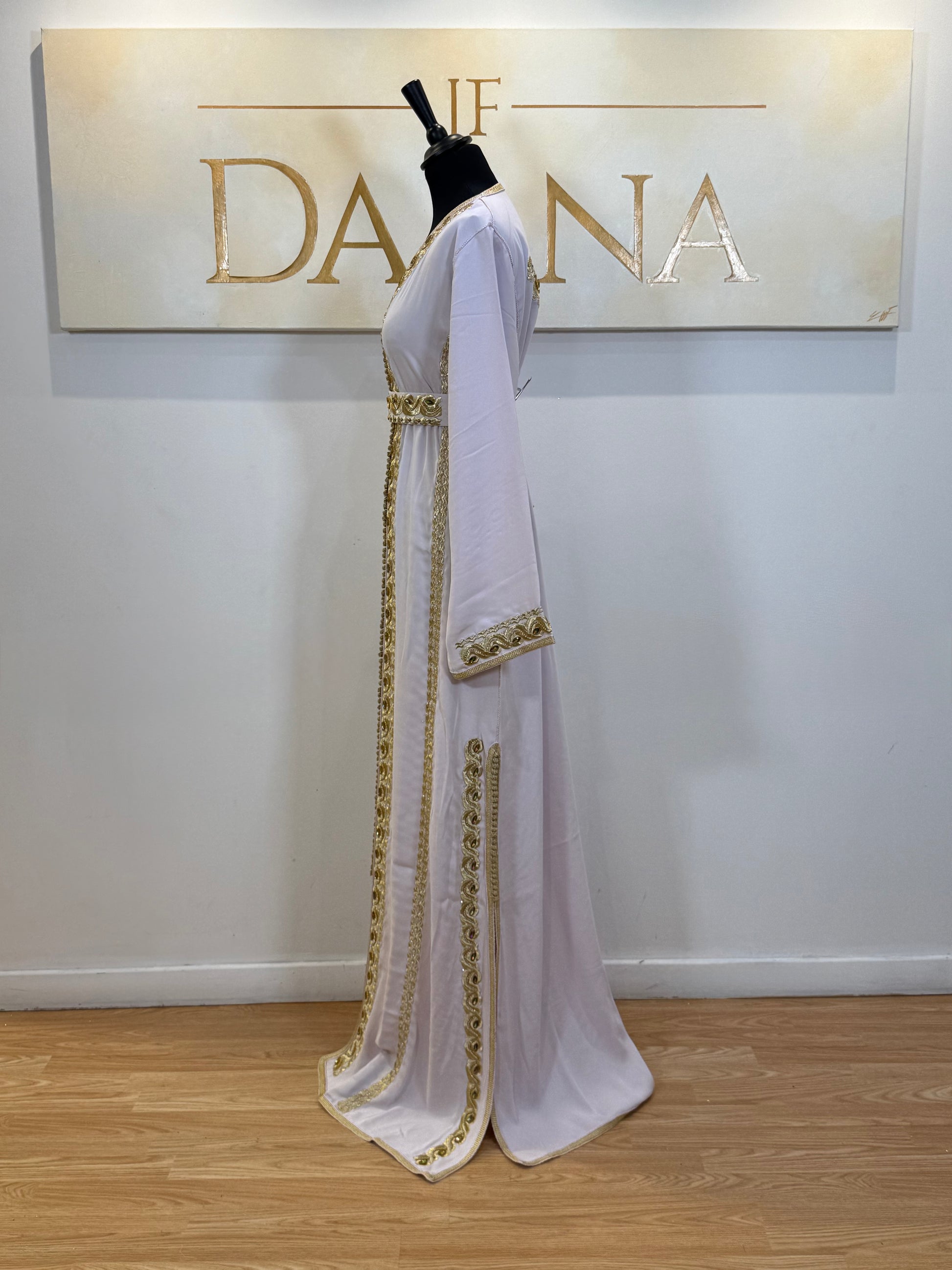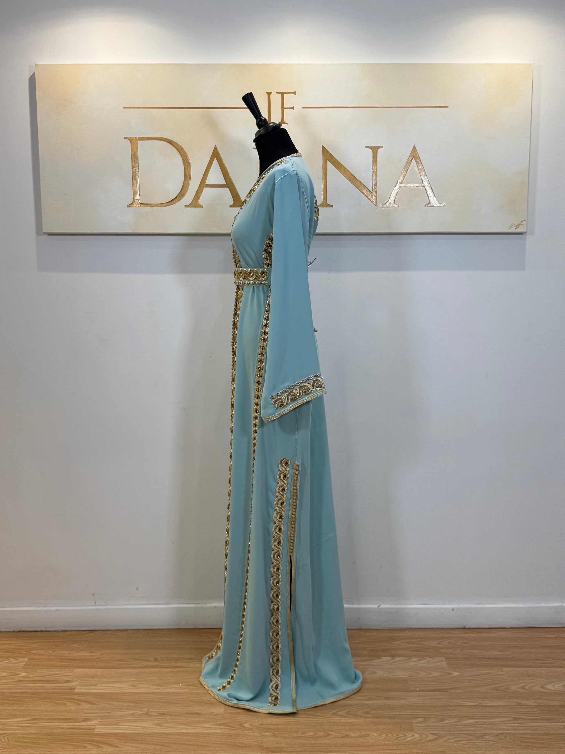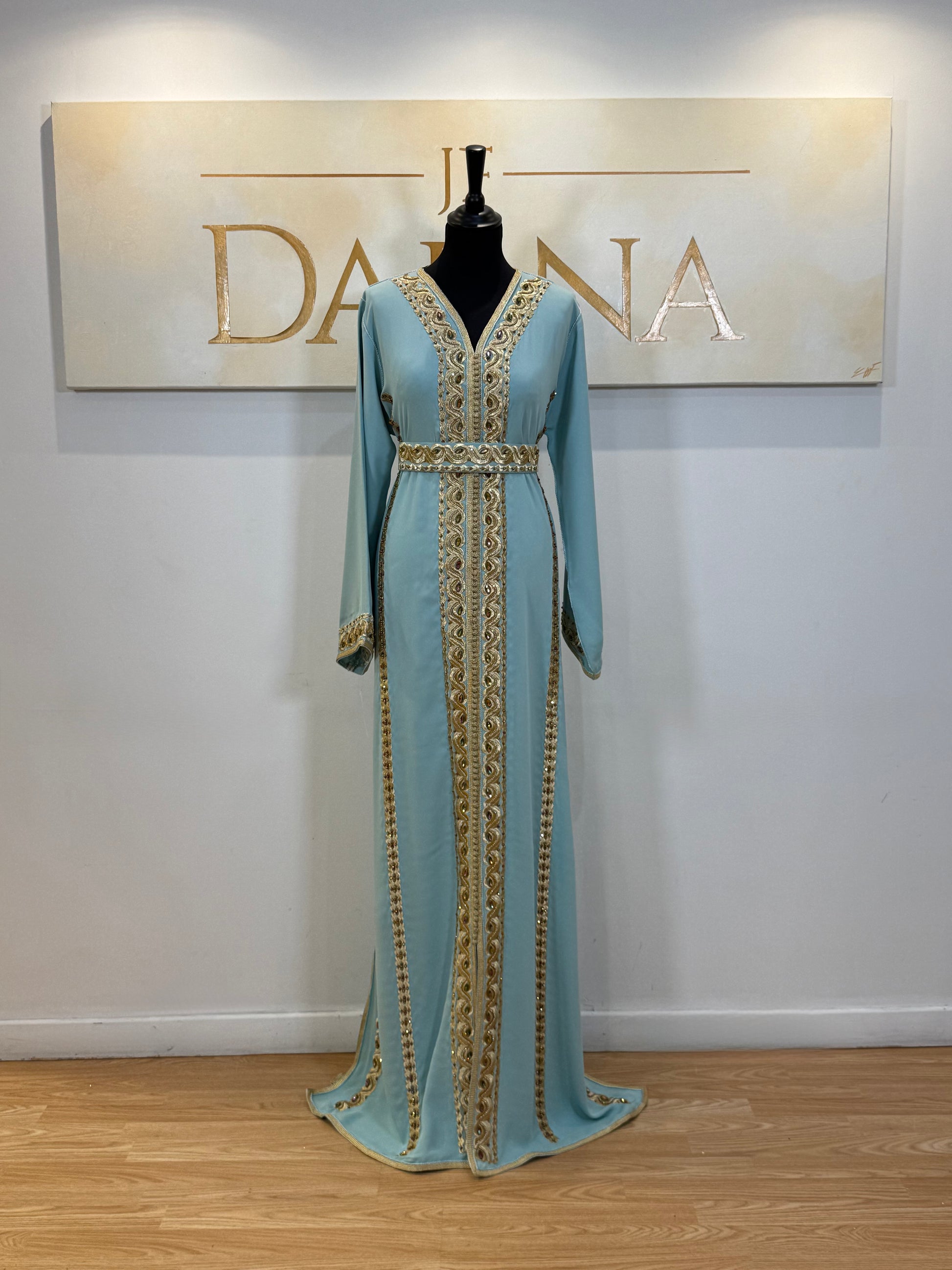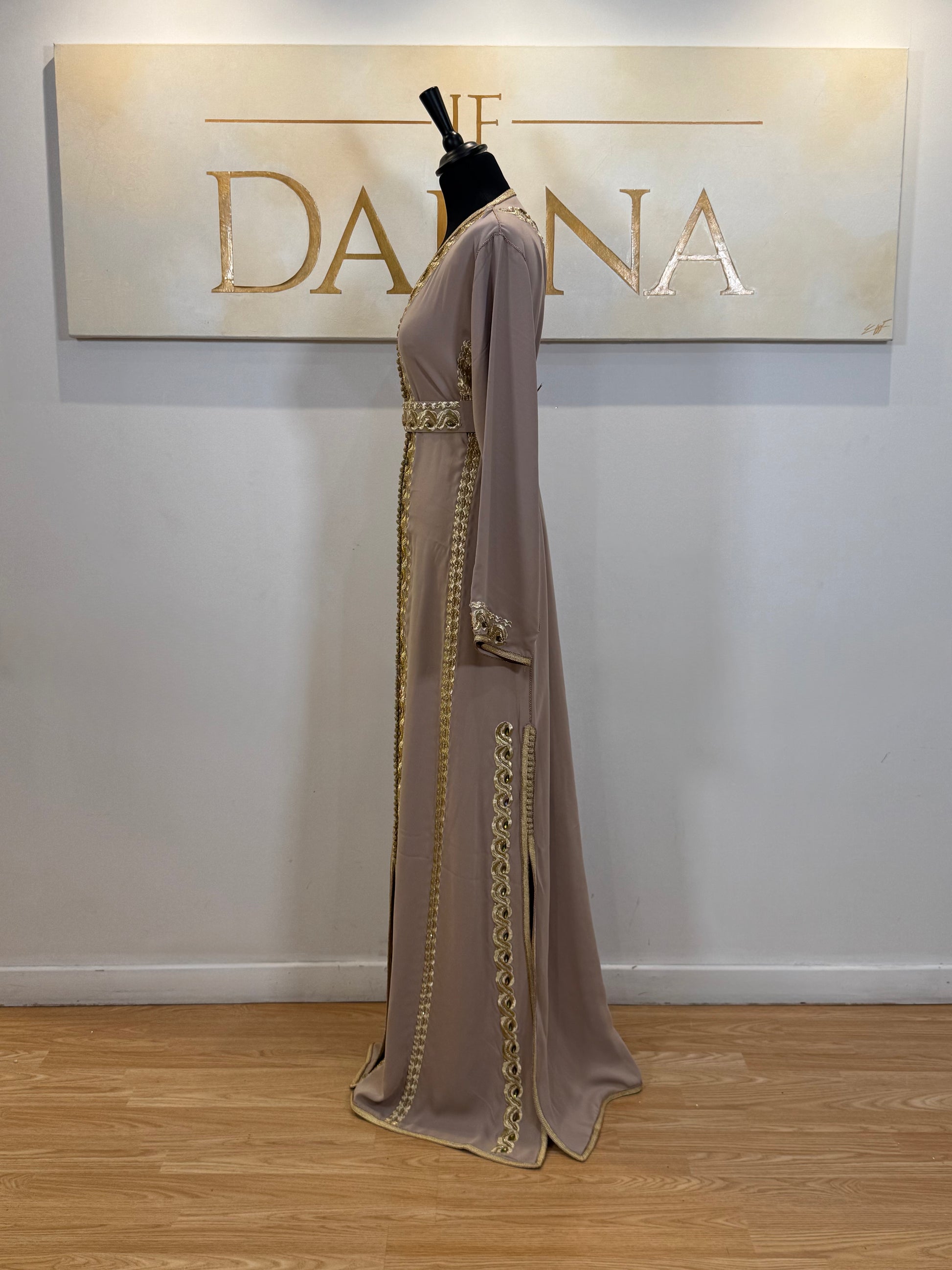 Le modèle Lina est une robe élégante, sublimée par des broderies dorées intégrées qui soulignent la silhouette avec finesse. Sa coupe fluide offre un tombé naturel, idéal pour les cérémonies et événements habillés.