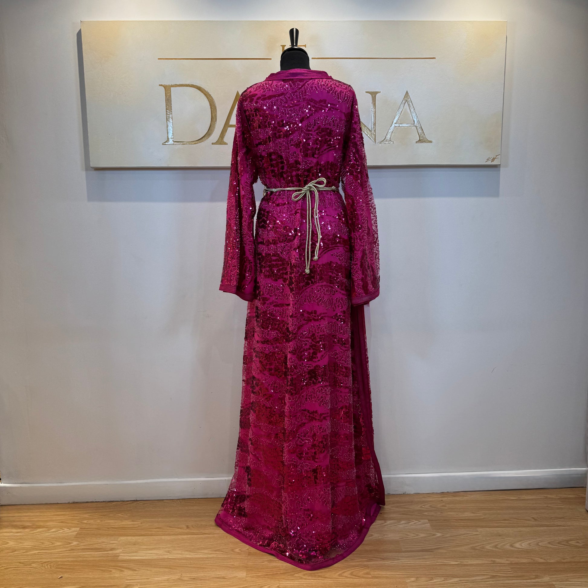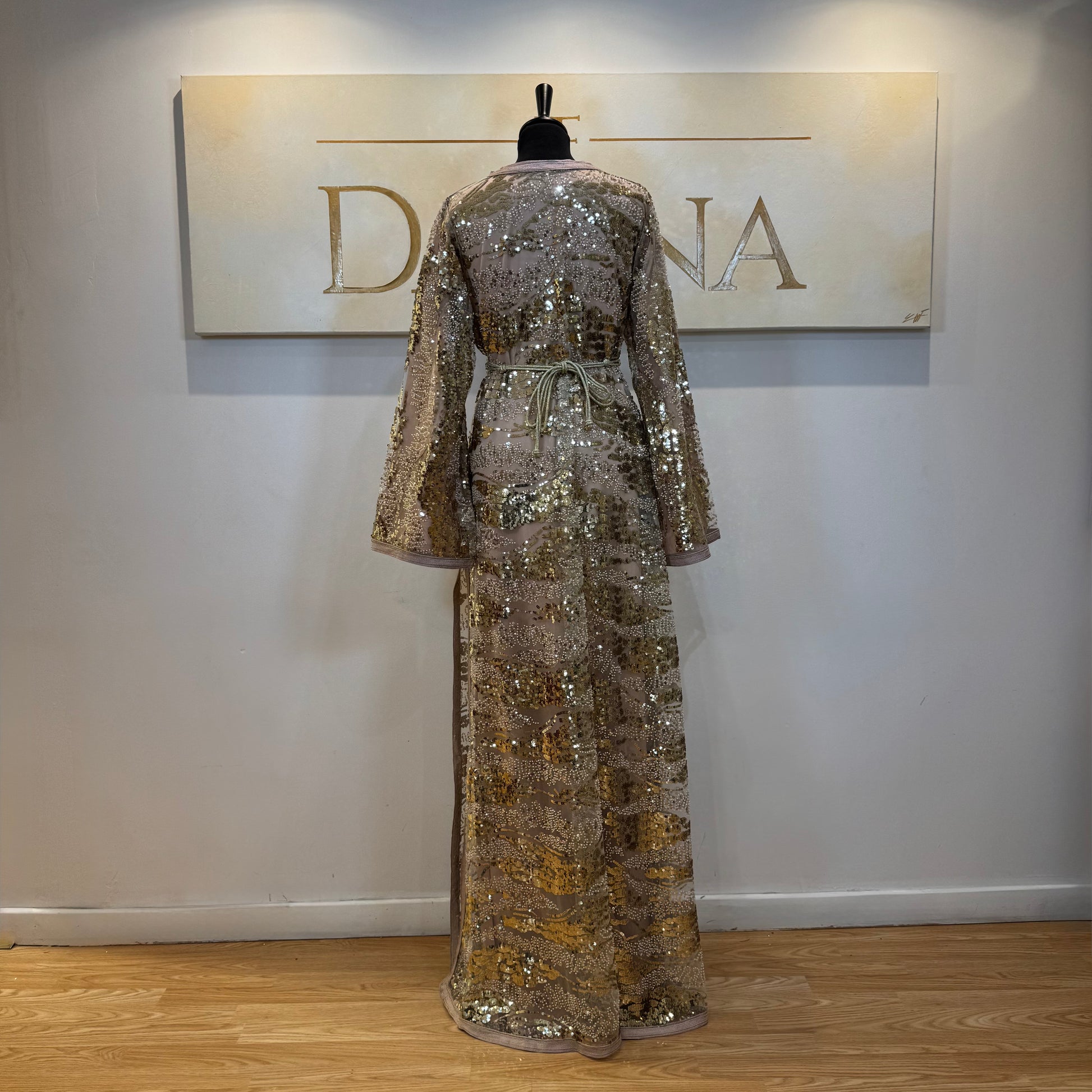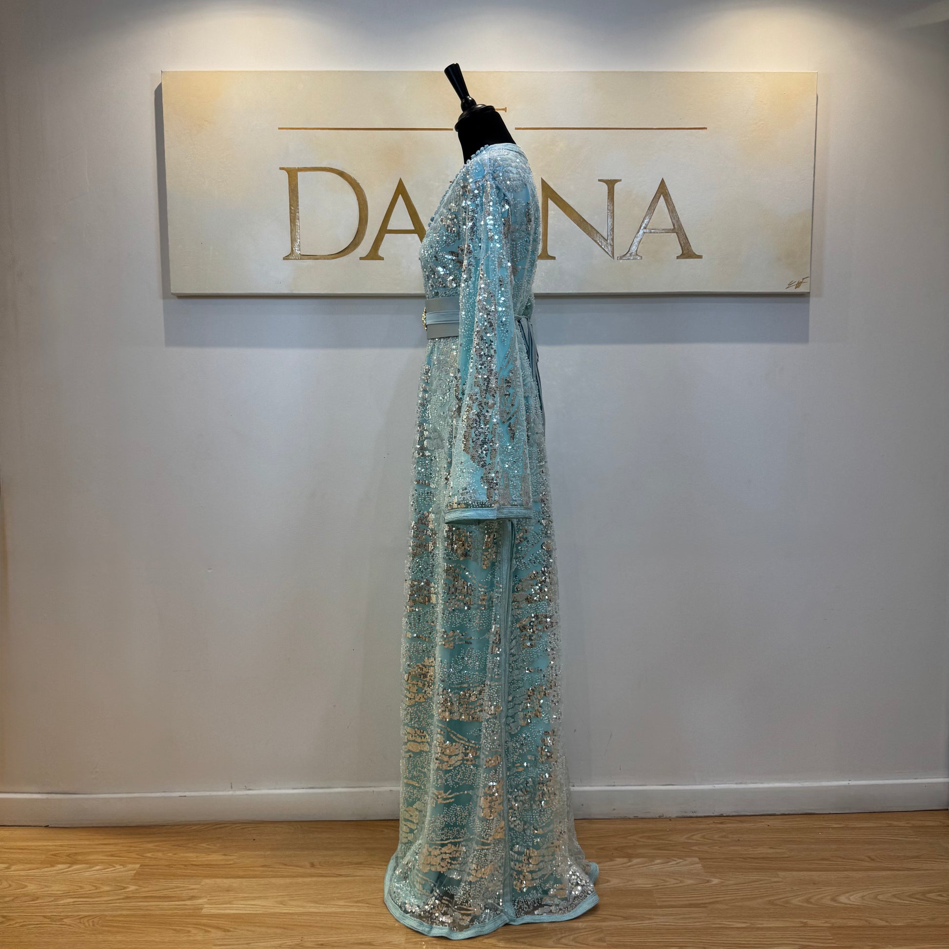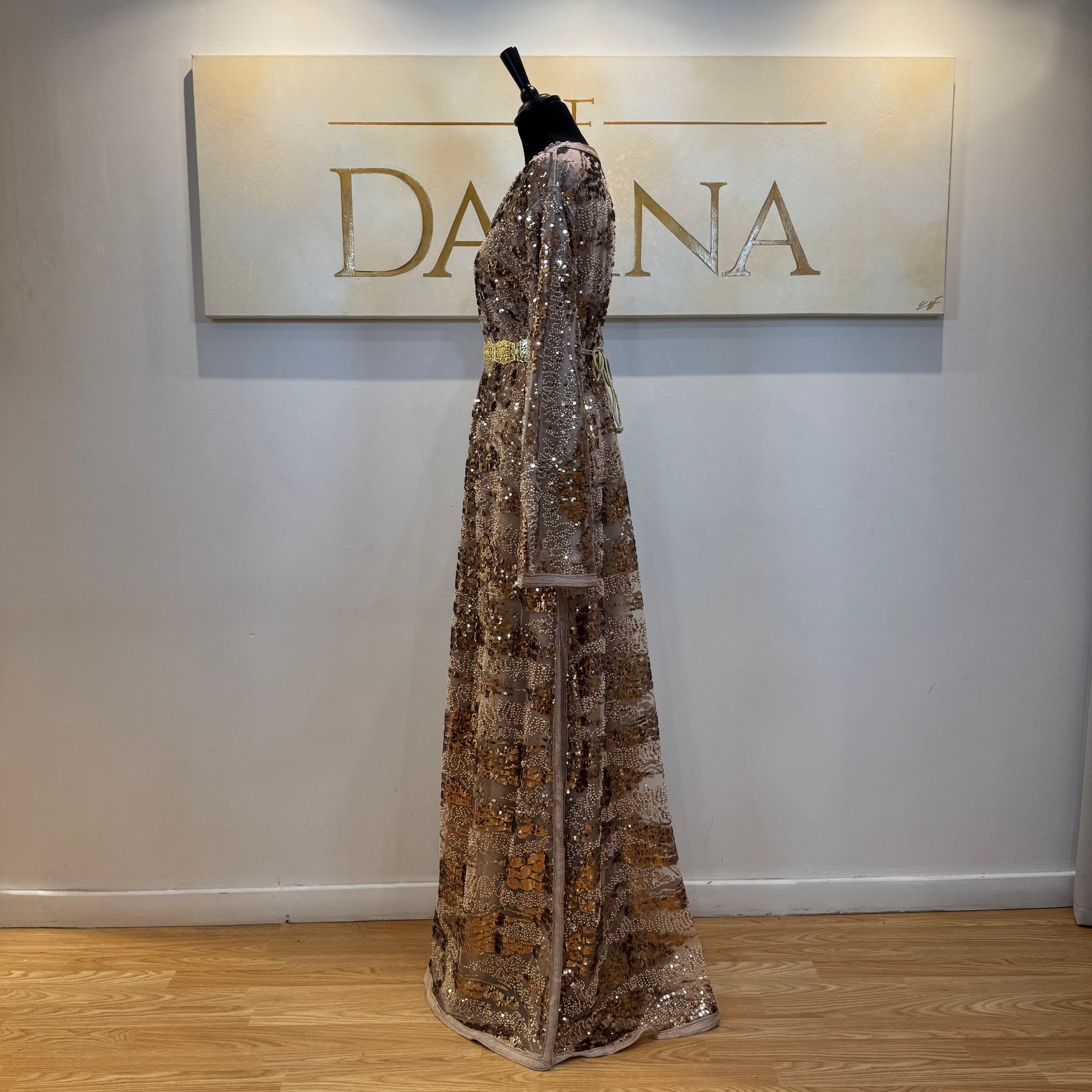 Le modèle Mayssa est une robe élégante au tissu pailleté, offrant une allure lumineuse et sophistiquée. Sa coupe longue et fluide assure un tombé naturel, idéal pour les cérémonies et événements habillés.