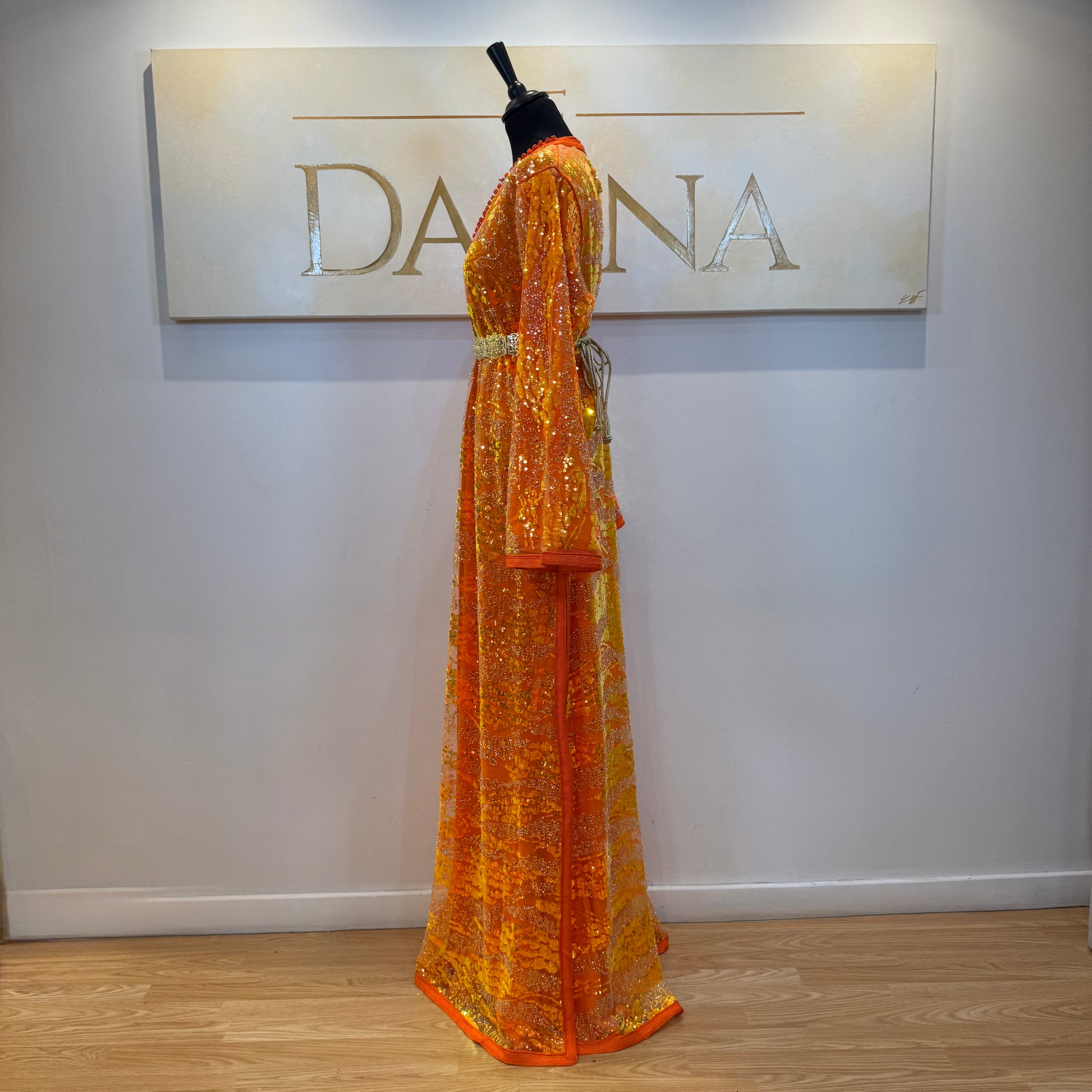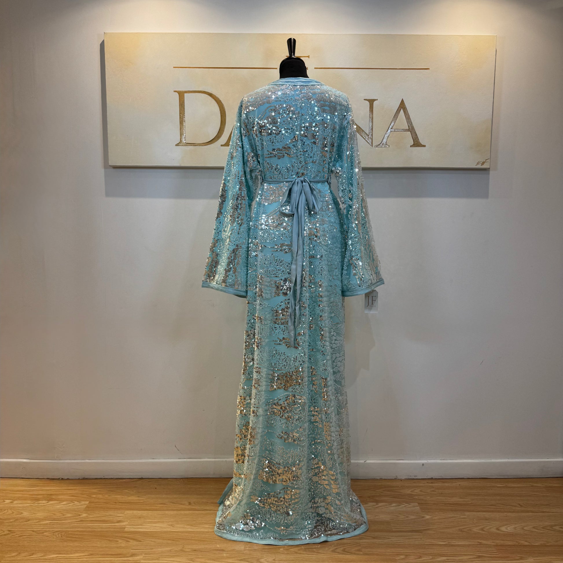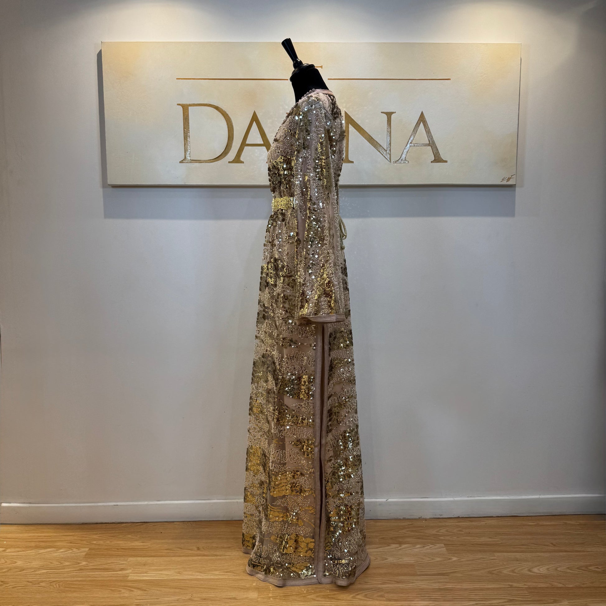 Le modèle Mayssa est une robe élégante au tissu pailleté, offrant une allure lumineuse et sophistiquée. Sa coupe longue et fluide assure un tombé naturel, idéal pour les cérémonies et événements habillés.