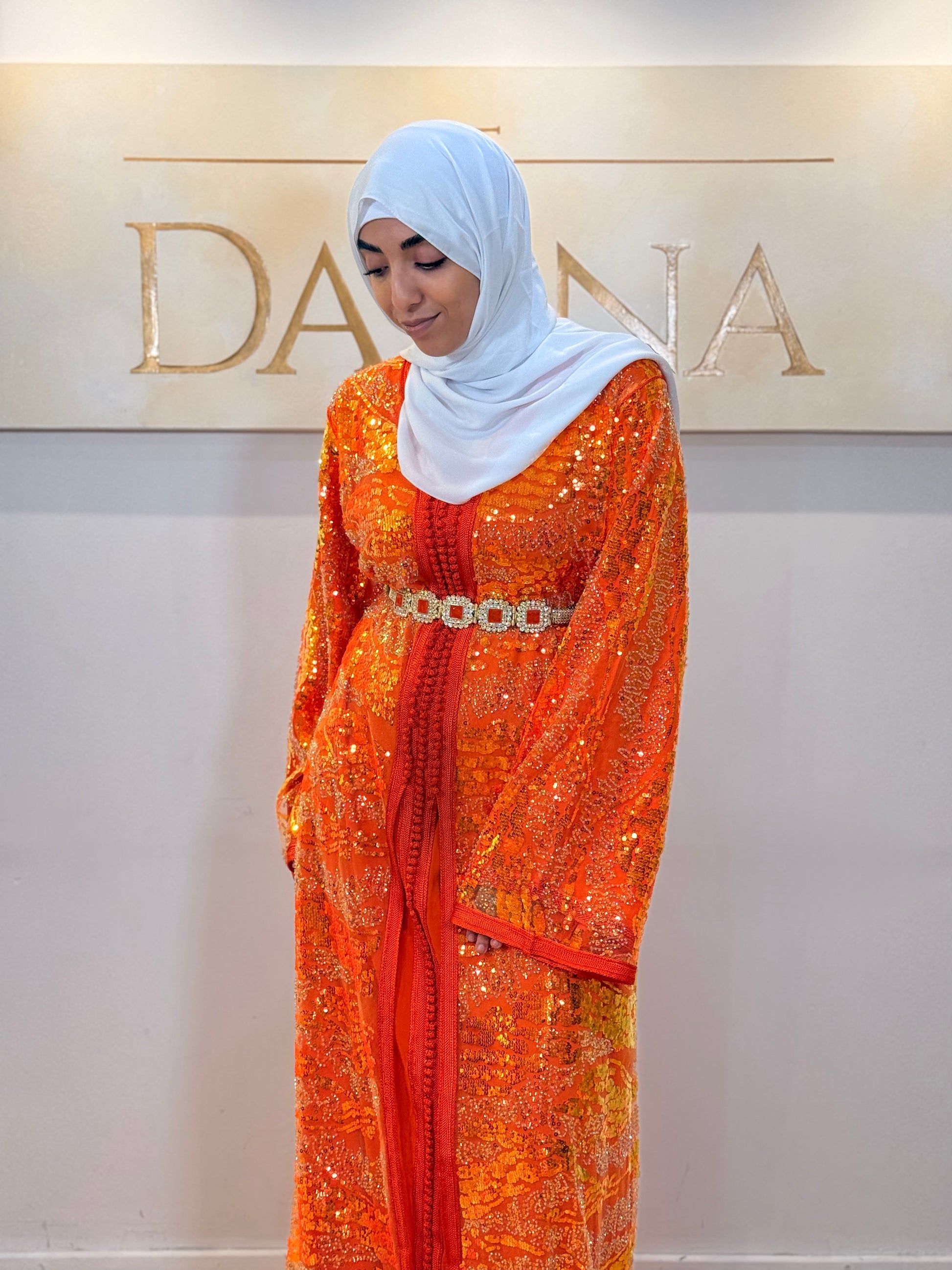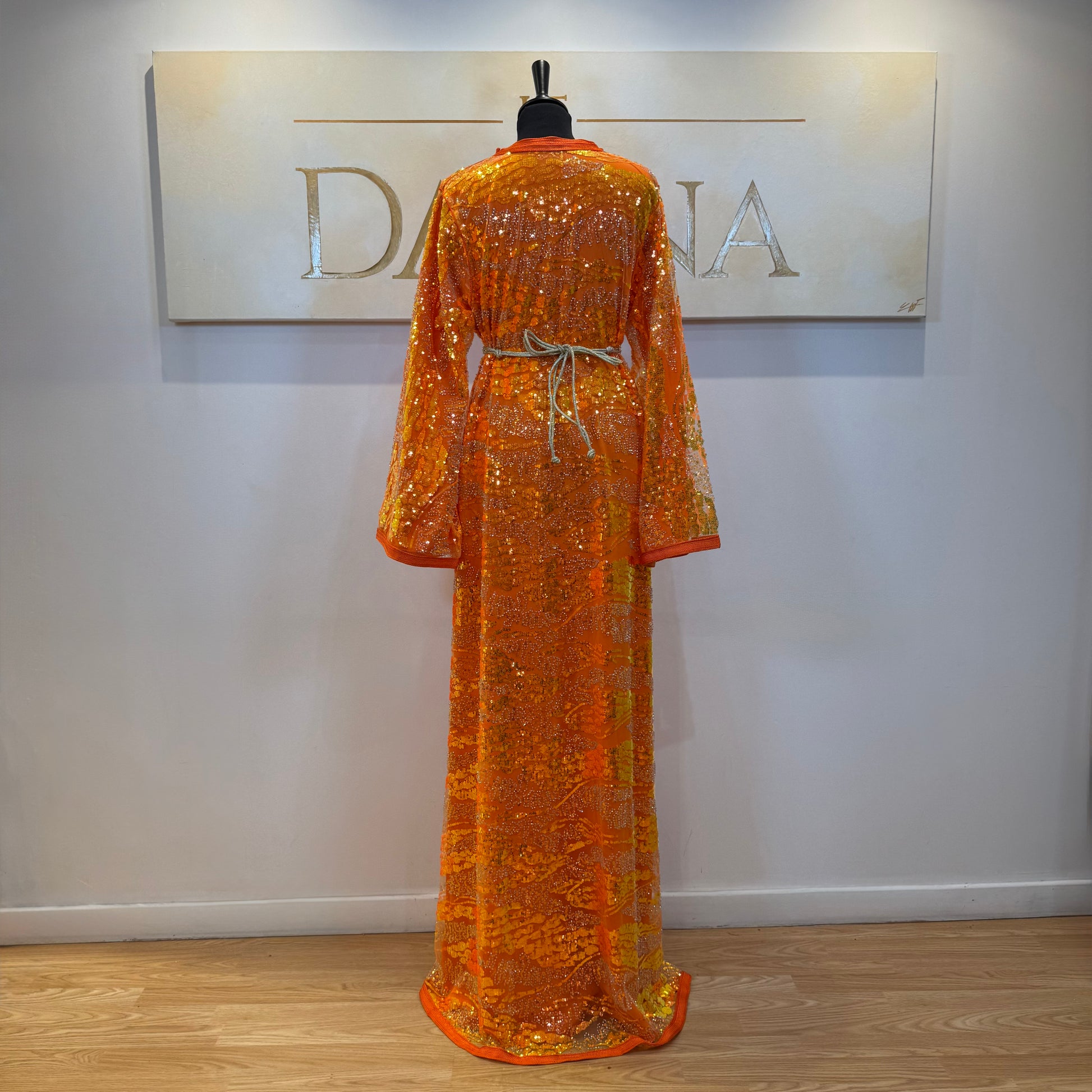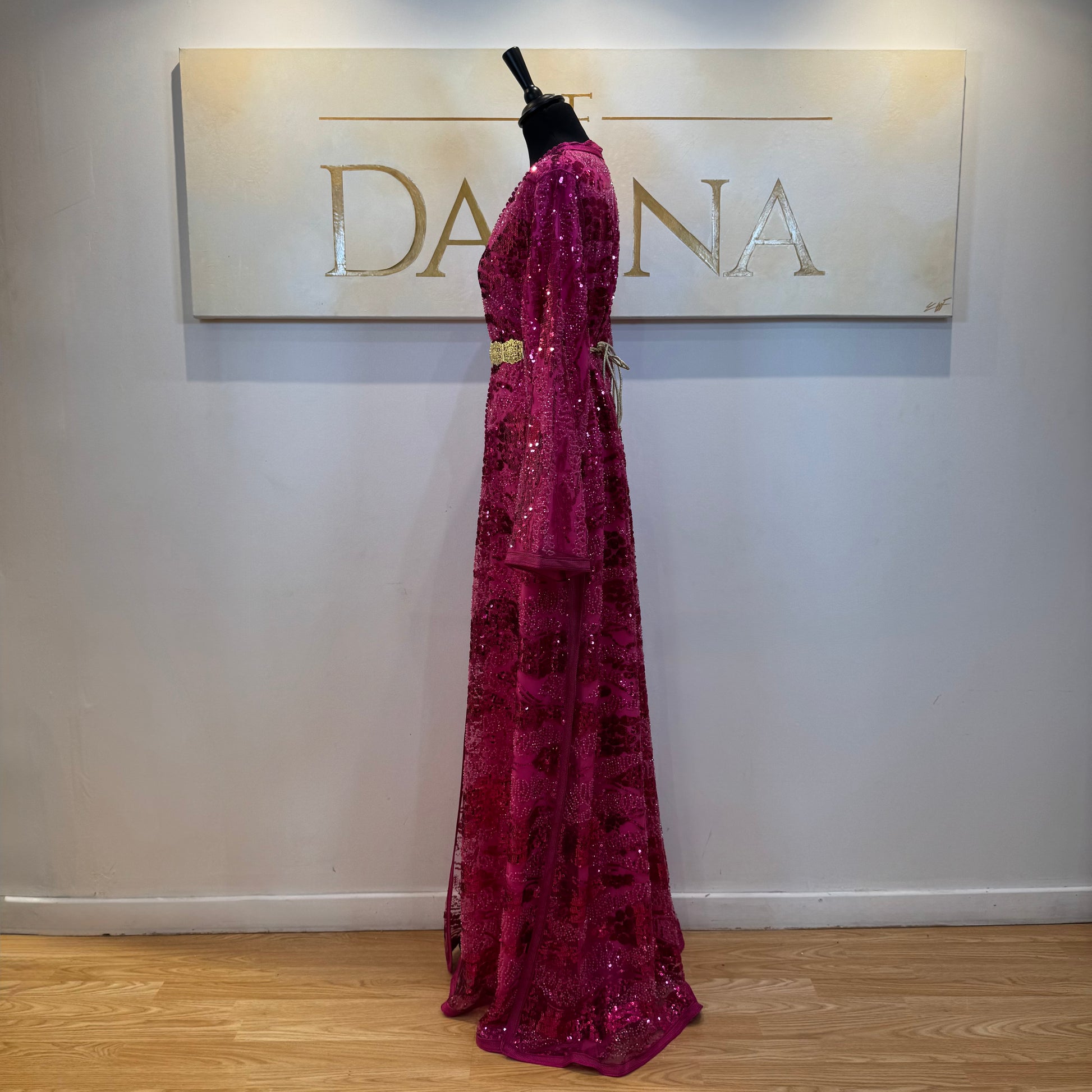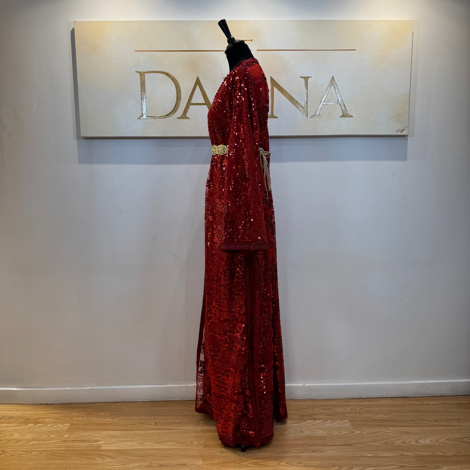 Le modèle Mayssa est une robe élégante au tissu pailleté, offrant une allure lumineuse et sophistiquée. Sa coupe longue et fluide assure un tombé naturel, idéal pour les cérémonies et événements habillés.