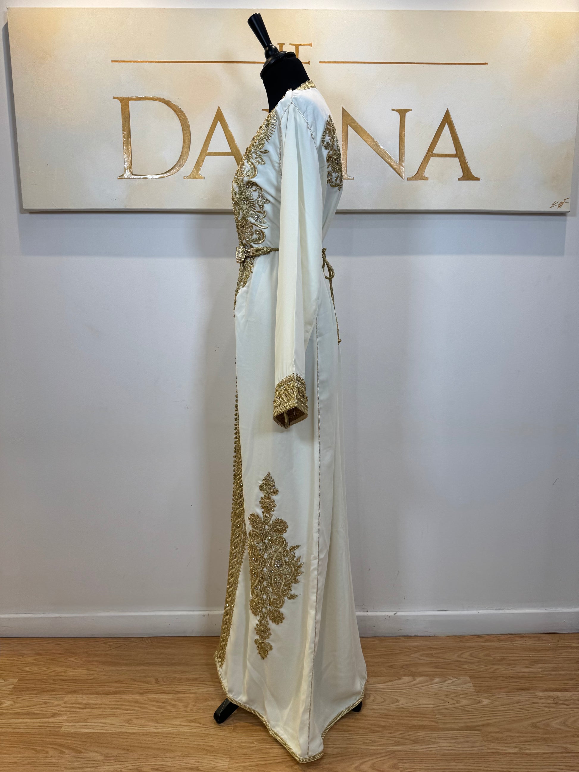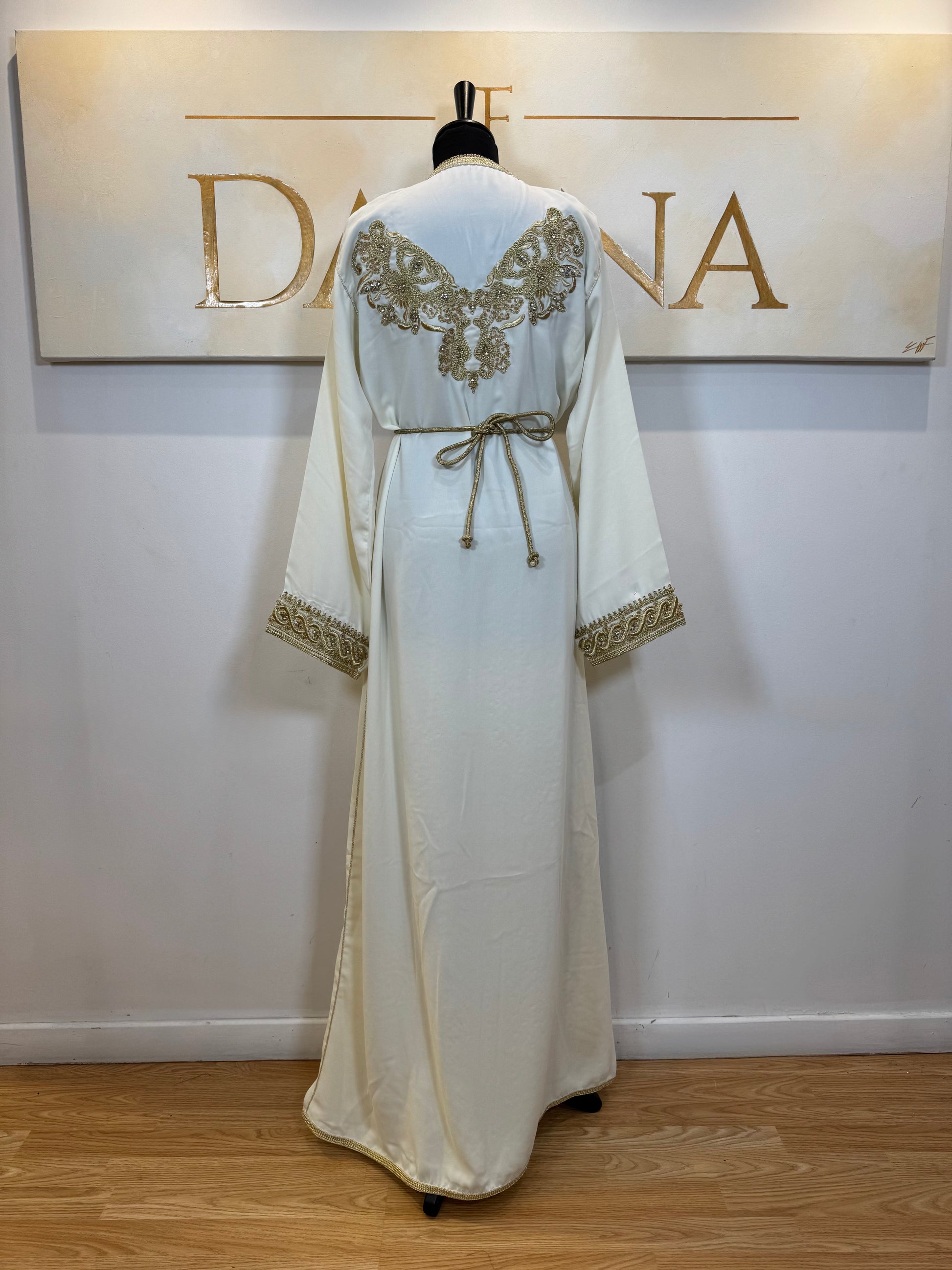 Le modèle Nadia séduit par ses broderies dorées élégantes et son design travaillé à l’avant comme à l’arrière. Sa coupe longue met en valeur la silhouette tout en offrant une allure raffinée et harmonieuse, idéale pour les grandes occasions.