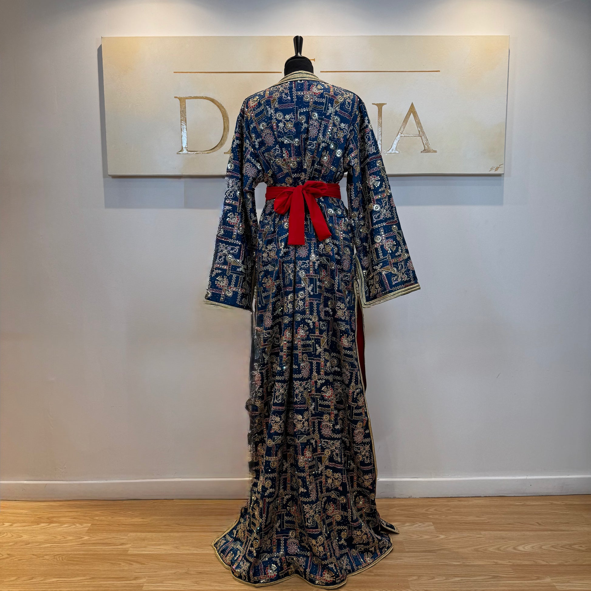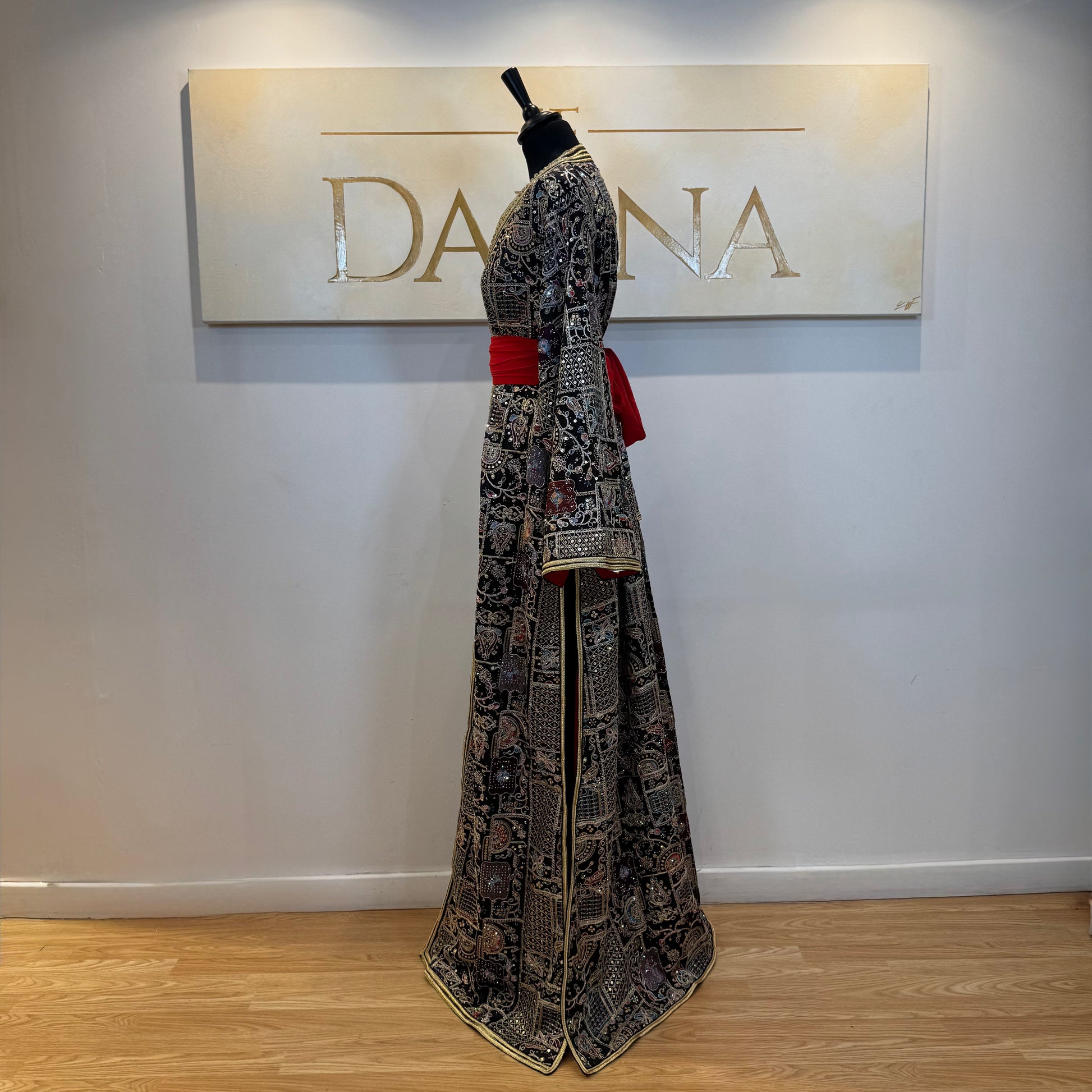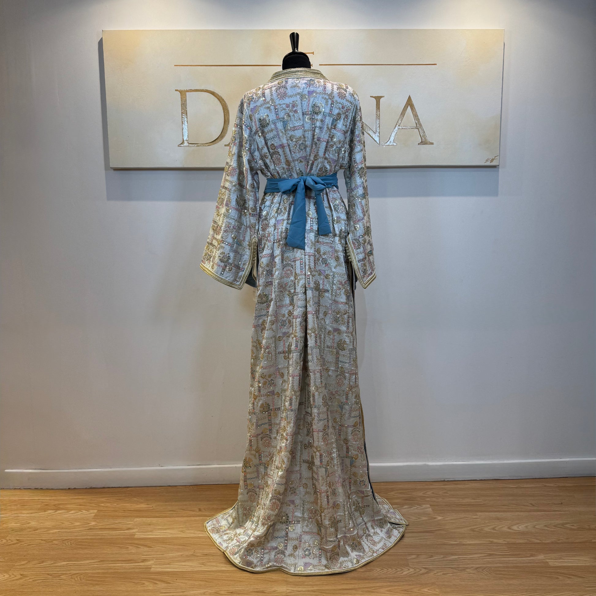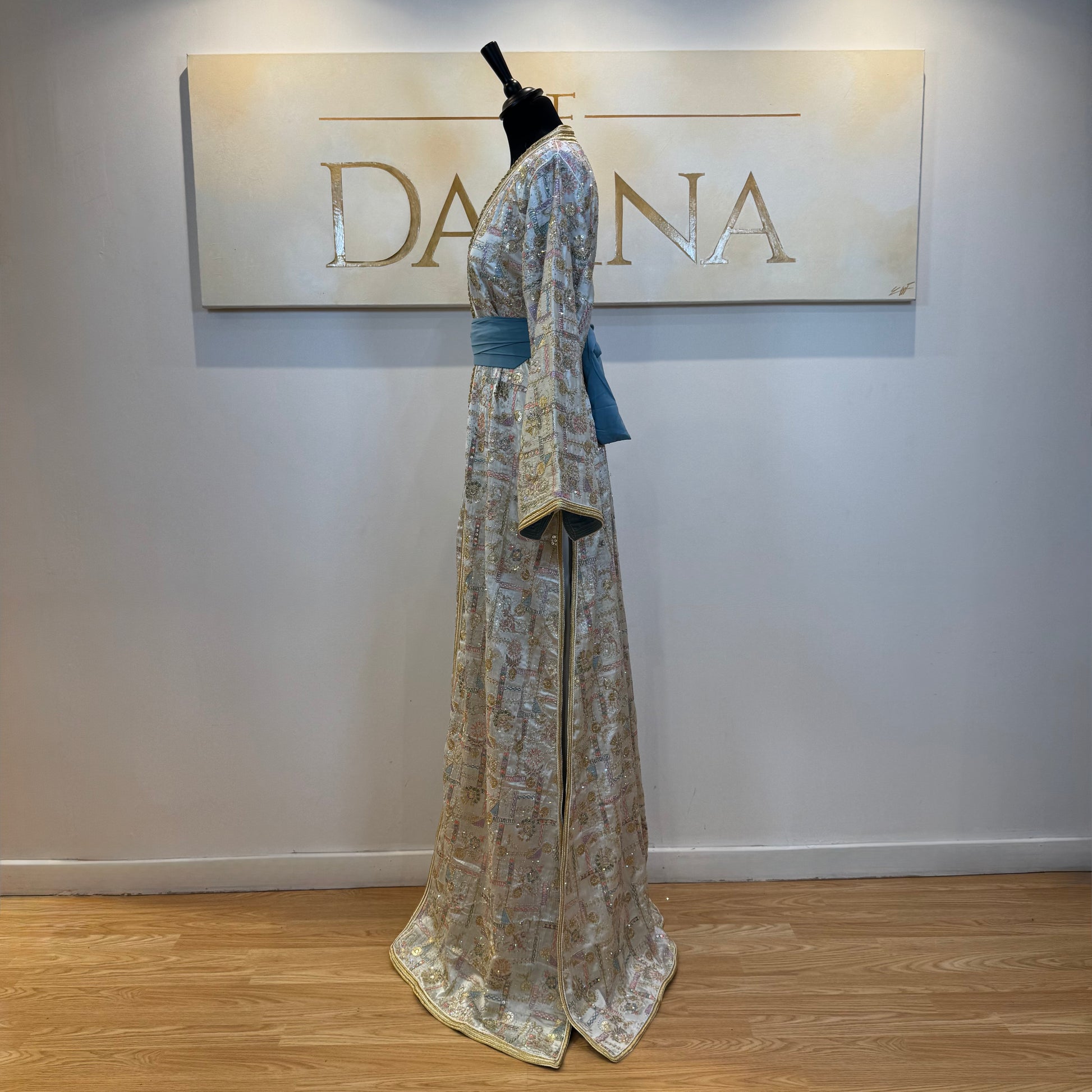 Le modèle Nour se distingue par son tissu richement travaillé aux motifs délicats, offrant une allure élégante et raffinée. Sa coupe longue et fluide sublime la silhouette, idéale pour les cérémonies et occasions habillées.