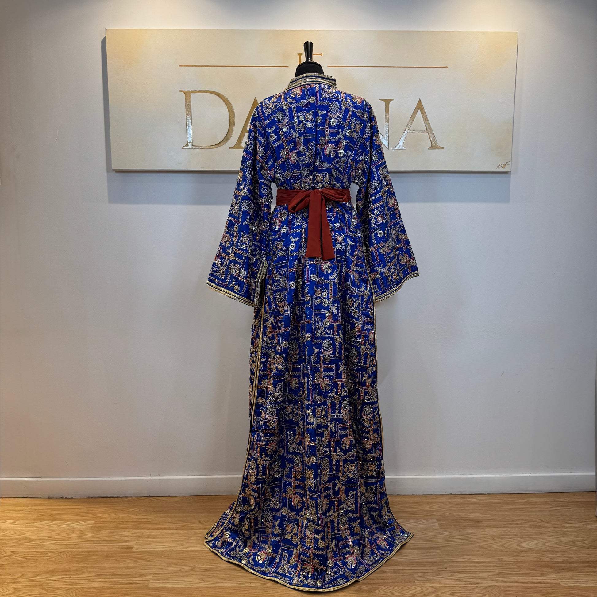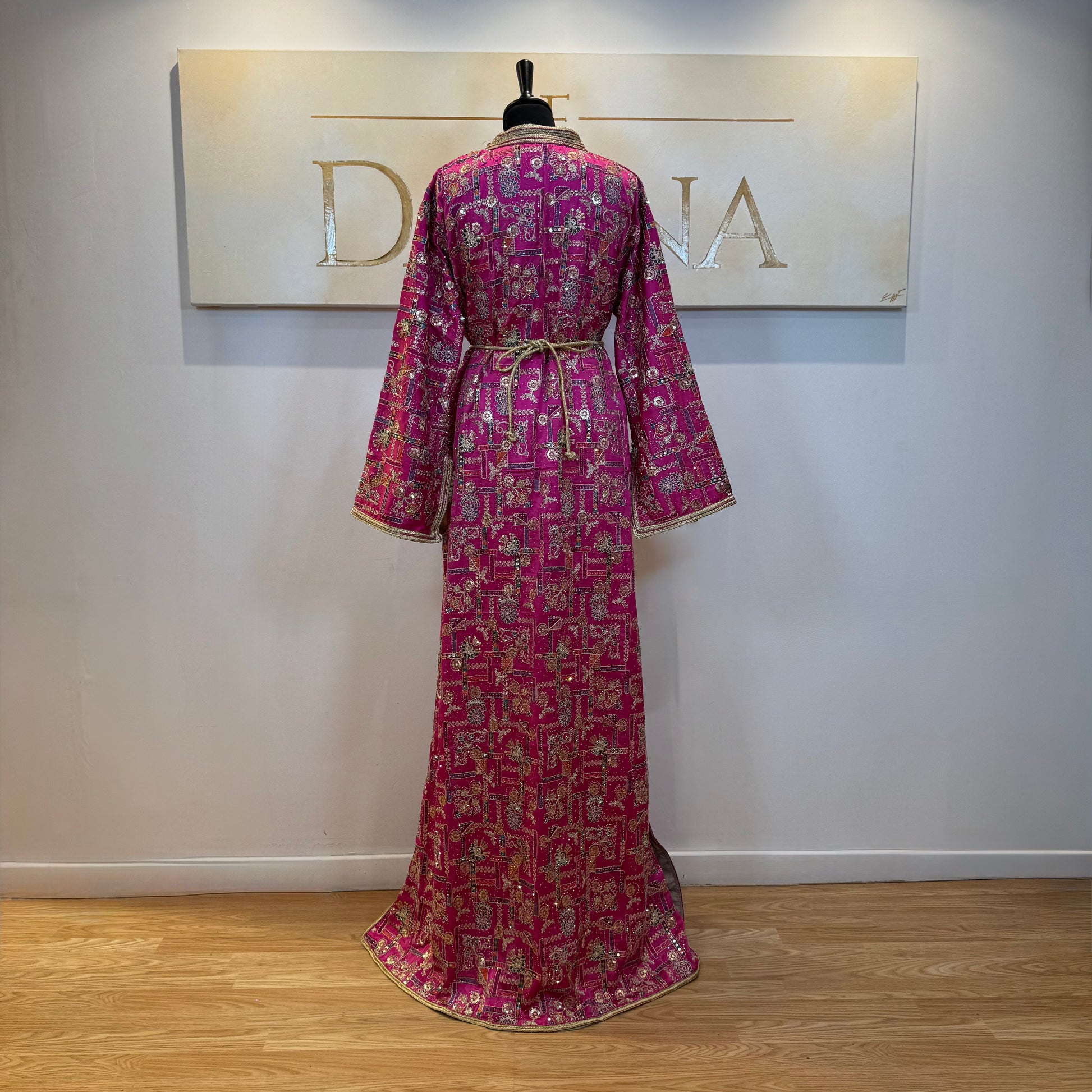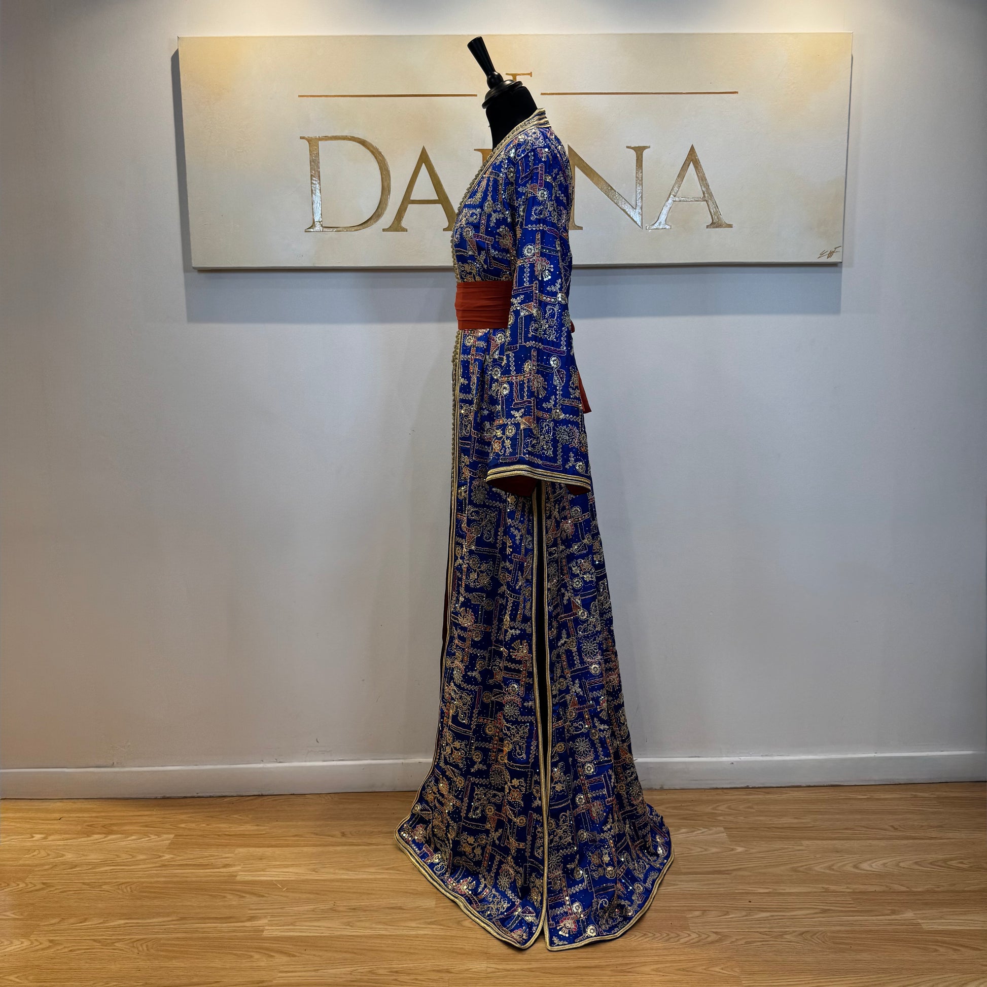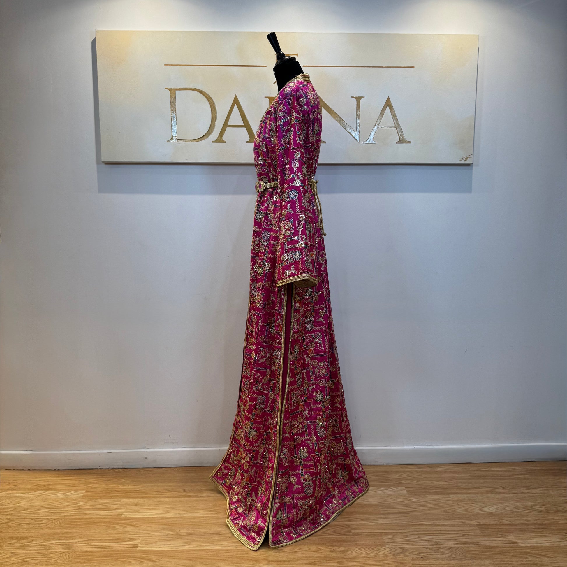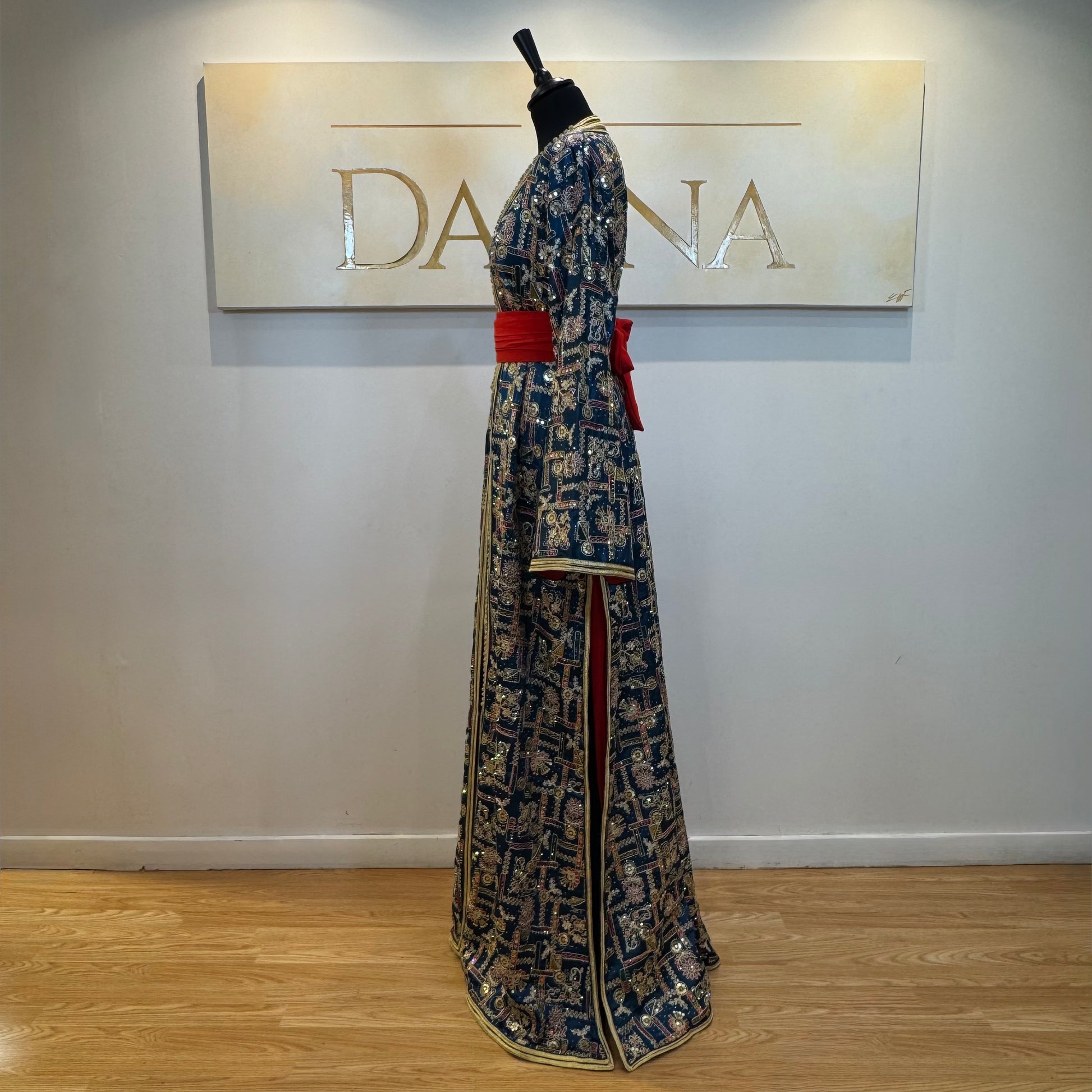 Le modèle Nour se distingue par son tissu richement travaillé aux motifs délicats, offrant une allure élégante et raffinée. Sa coupe longue et fluide sublime la silhouette, idéale pour les cérémonies et occasions habillées.