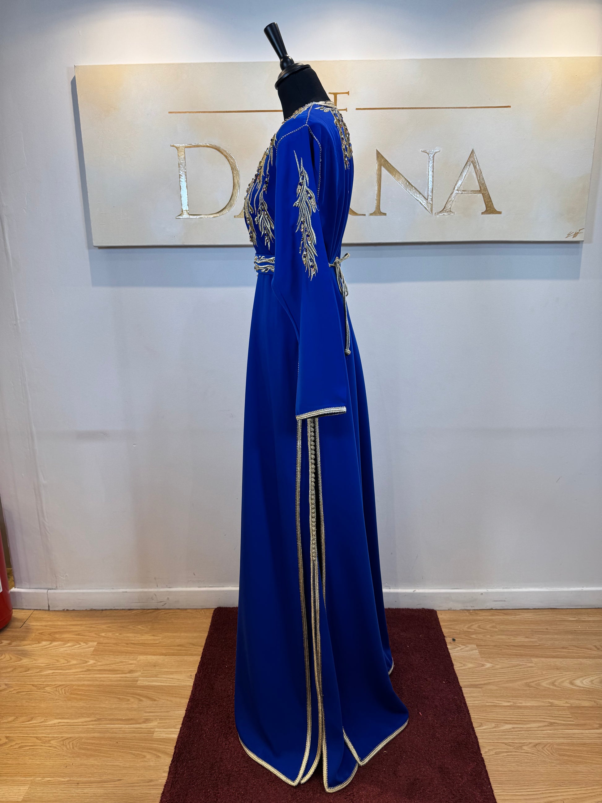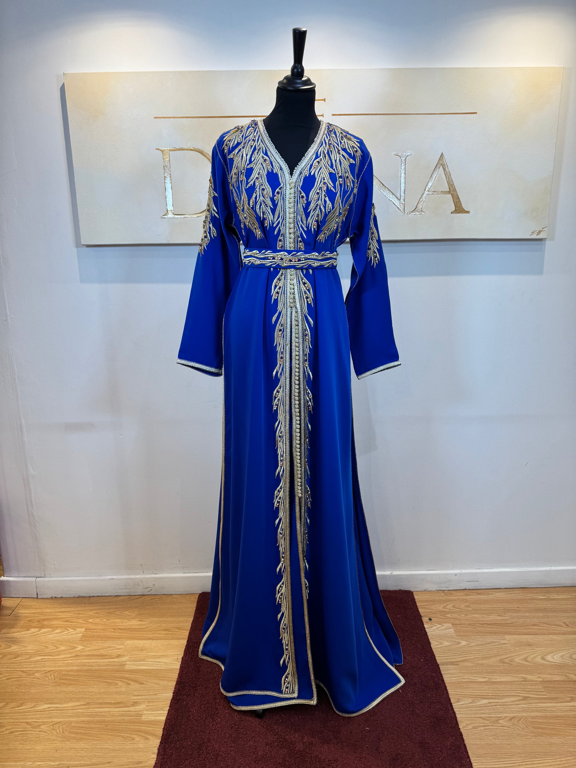 Le modèle Rania est une robe élégante au fond noir profond, sublimée par des broderies dorées finement travailléesqui apportent une allure noble et sophistiquée. Les motifs délicats soulignent la silhouette et créent un contraste raffiné, idéal pour les cérémonies et événements habillés.