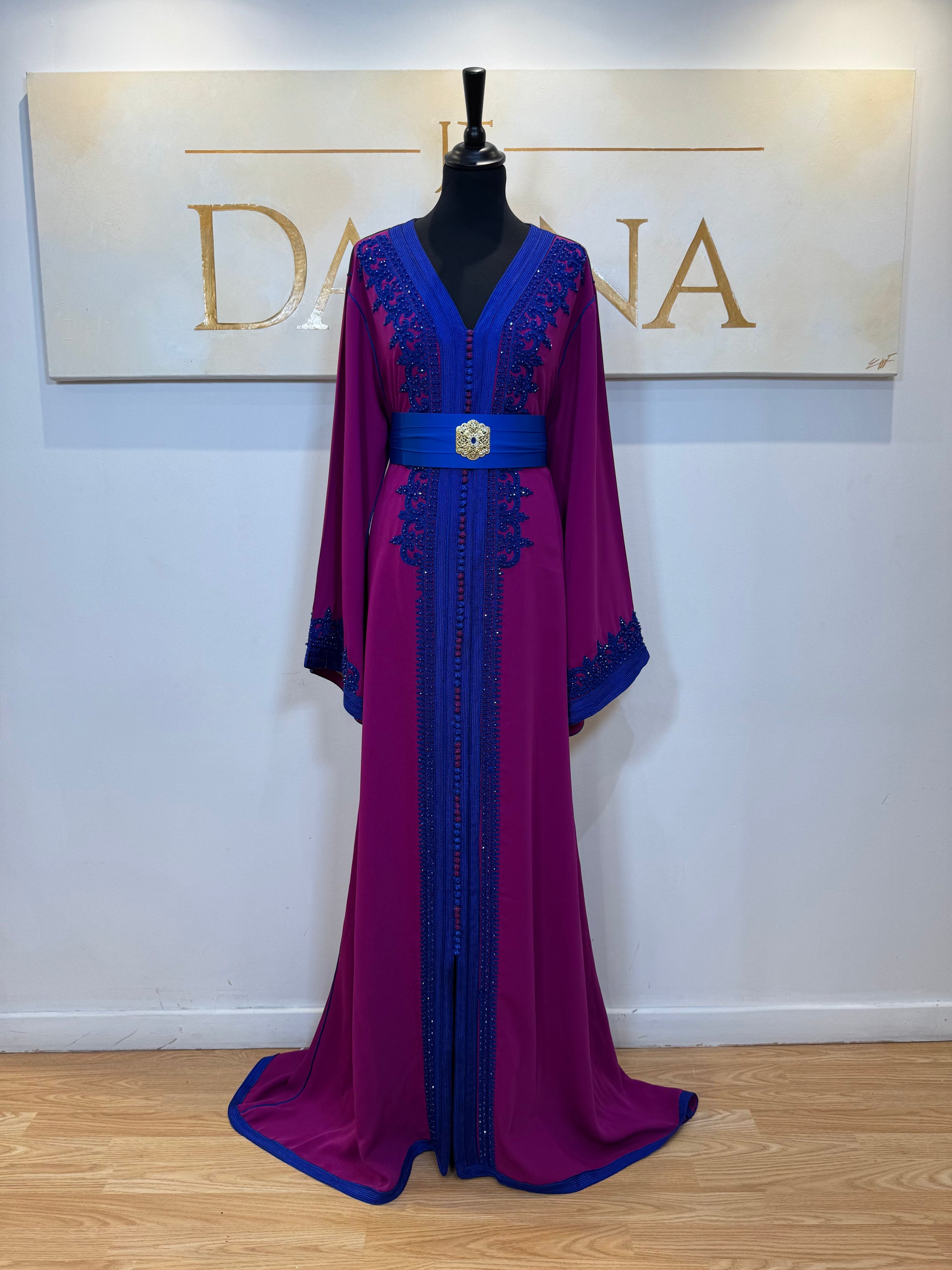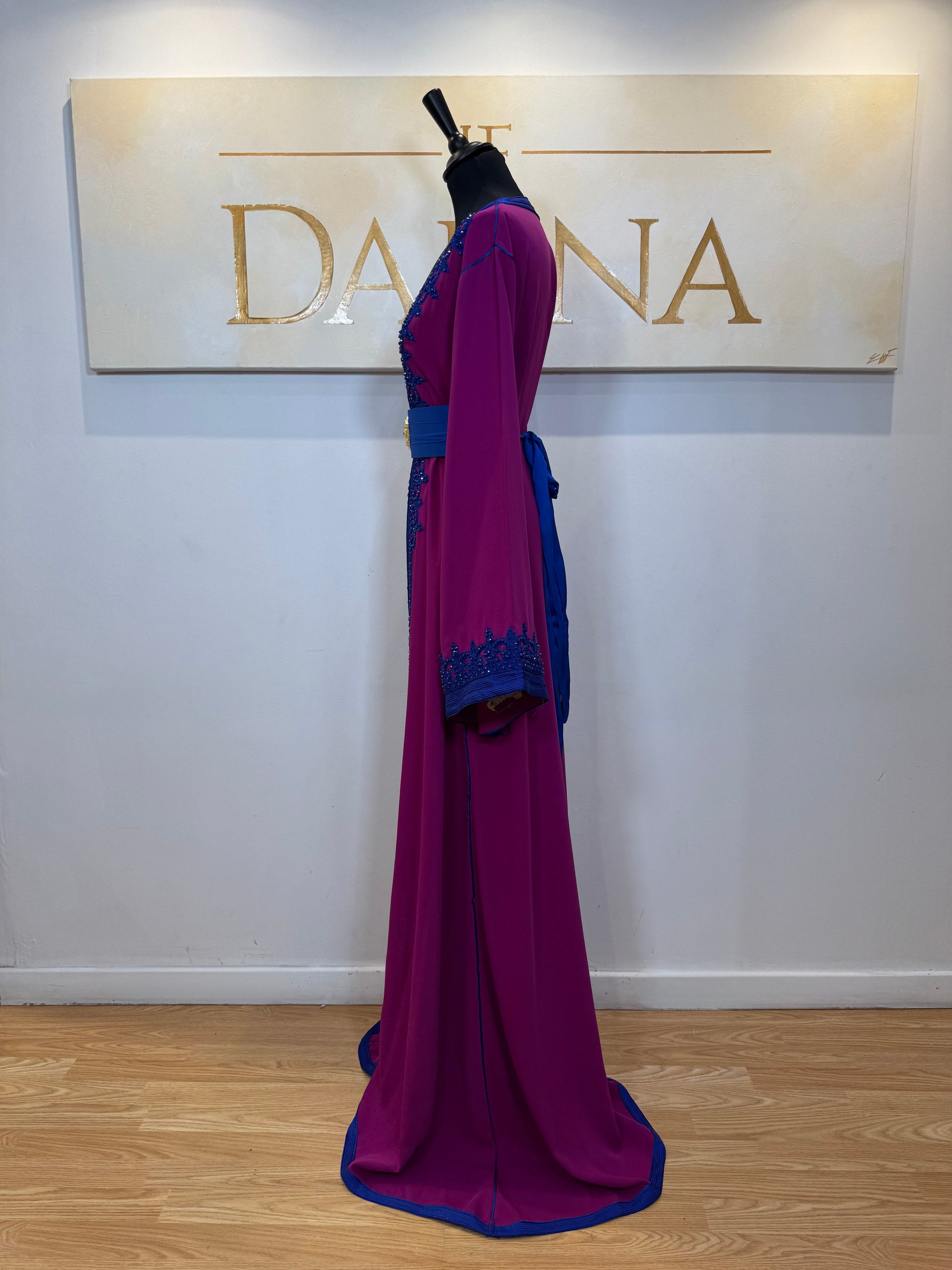 Le modèle Siham se distingue par son contraste élégant entre un violet profond et des finitions bleu intense, créant une allure à la fois raffinée et affirmée. Les broderies délicates soulignent le décolleté et les manches, apportant une touche de caractère tout en conservant une ligne harmonieuse.