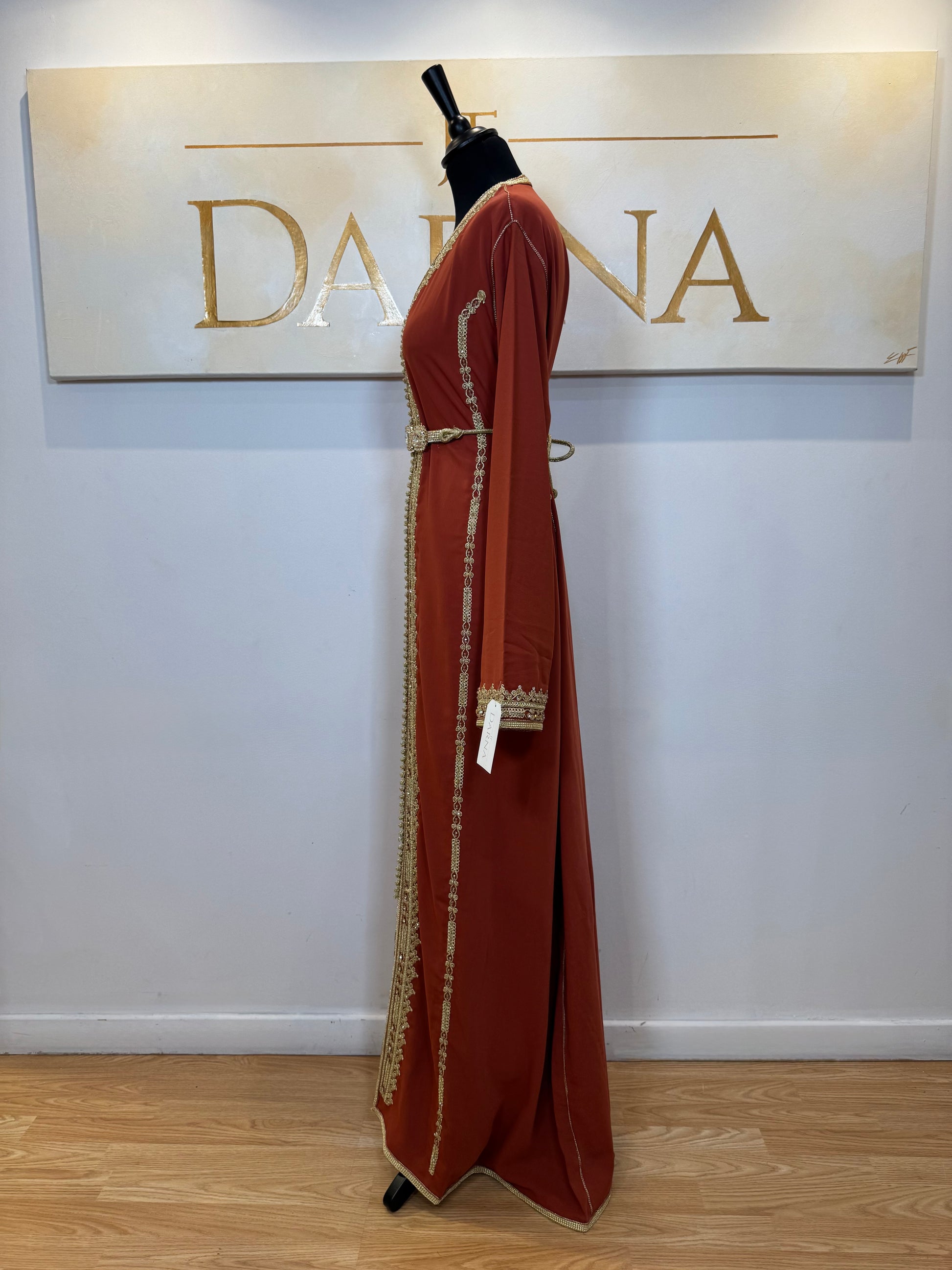 Le modèle Warda se distingue par sa teinte chaude et profonde, associée à des broderies délicates qui dessinent la robe avec finesse. Son design allongé met en valeur la verticalité de la silhouette, tandis que les ornements brodés apportent une touche élégante sans surcharge.